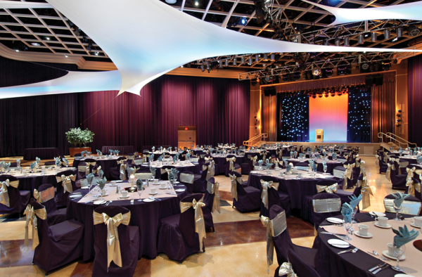 This locals casino and hotel with a mildly kitschy Old West/stampede theme is about 20 minutes off the Strip. It offers the standard range of somewhat drab hotel meeting rooms and function spaces, but what makes it really special is the 25,000 square foot atrium called Mystic Falls Park. It’s a toasty (nearly tropical, as in the winter when I visited) indoor setting with a lot of natural light and a patio that overlooks the half acre of waterfalls and trees of the park below from the second level. The overlook is available for ceremonies starting at $350 for up to 100 people.
