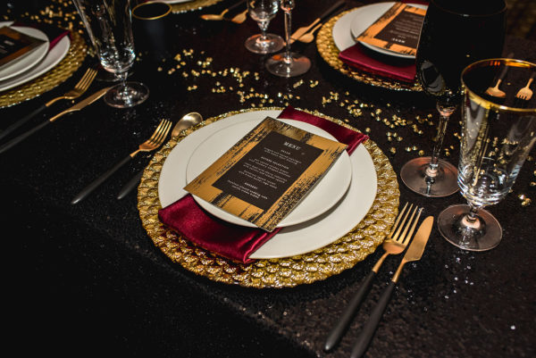 Who says your small and intimate Las Vegas wedding needs to be simple? Deep, deluxe colors accent this luxurious, moody styled elopement shoot. The burgundy, gold and black tones are so rich and seasonal, and perfectly complementary to the textures in the textiles and stationery. The visual impact is striking, and adds to the vintage feel.