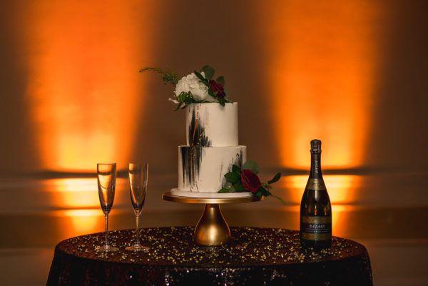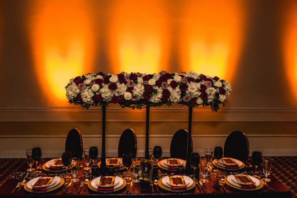 Dramatic florals and uplighting at the reception add to the theme, reminding me of a luxury New Year’s Eve celebration or another late night banquet or event. This elopement inspiration shoot at Alexis Park Resort combines garden and ballroom in a unique way, and it’s fabulous!
