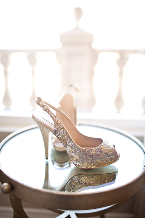 The bride’s delicate Alençon lace and frothy tulle gown came from Lazaro, and those sparkly platforms from BCBG.