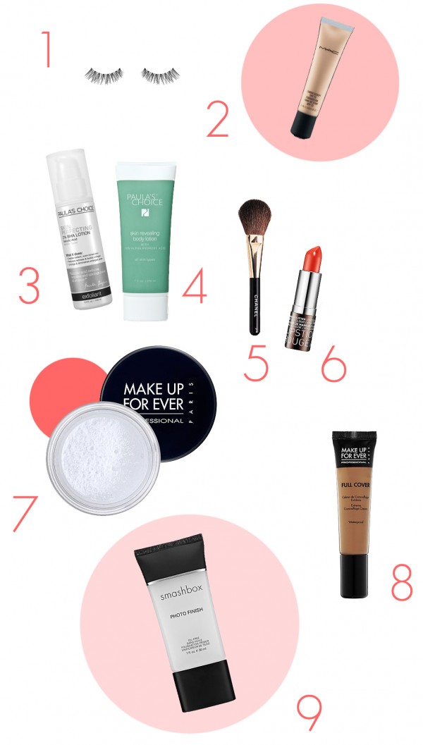 1: Ardell 120 demi black lashes $4 2: MAC Studio Sculpt Foundation $36.50 3: Paula’s Choice 2% BHA Lotion $18.95 4: Paula’s Choice 10% AHA Skin Revealing Body Lotion $22.95 5. Chanel Blush Brush $48 6. Korres Mango Butter Lipstick SPF 10 $18 7. Make Up Forever HD Microfinish Powder $32 8. Make Up Forever Full Cover Concealer $32 9. Smashbox Photo Finish Primer $36