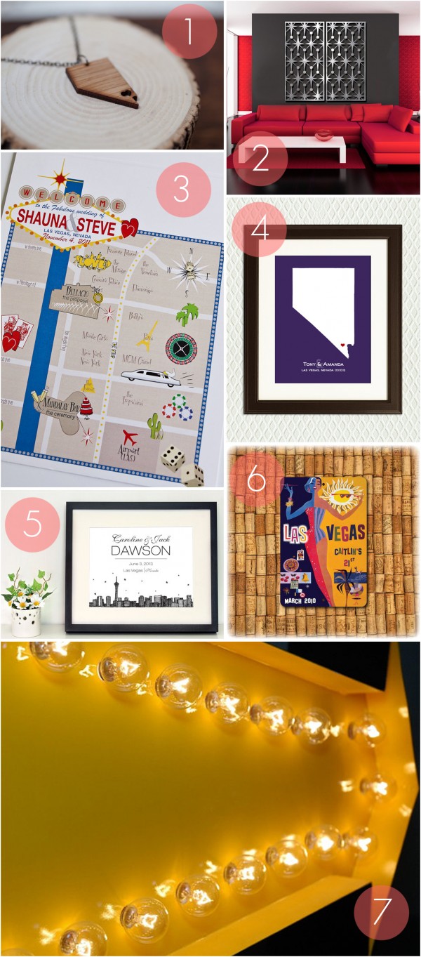 1. “I Heart Nevada” pendant in bamboo (also available in silver) by Stevie K 2. Hand brushed aluminium wall sculpture in a retro Vegas starburst style by Moda Industria 3. Not just for wedding invitations – consider getting a custom wedding map for after the fact from Carol Sullivan 4. Personalized Nevada print by myplaceintheworld 5. Customizable Vegas skyline art print by Pixie Chicago 6. Old school vintage Vegas print – customized with your name and details – by Chad Larson (based on an old TWA ad for Las Vegas!) 7. Steel marquee arrow in a Vegas sign style by ThrowbackDesigns