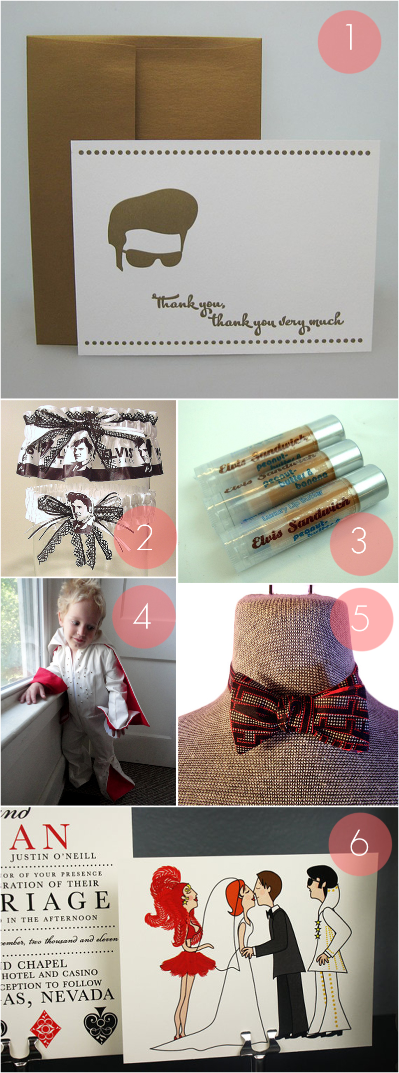 1. Letterpressed Elvis thank you cards by Fancy Seeing You Here 2. Monochromatic Elvis garters by Peterene Design 3. Good for thank you bags for bridesmaids, “Elvis Sandwich” peanut butter and banana lip balm by Soapopotamus 4. Perfect for a ring bearer, a mini Elvis jumpsuit by Nightwatch Couture 5. Reversible Elvis fabric bow tie by Jenells Revenge 6. Elvis and Showgirl Vegas inspired wedding invitations by Seahorse Bend Press
