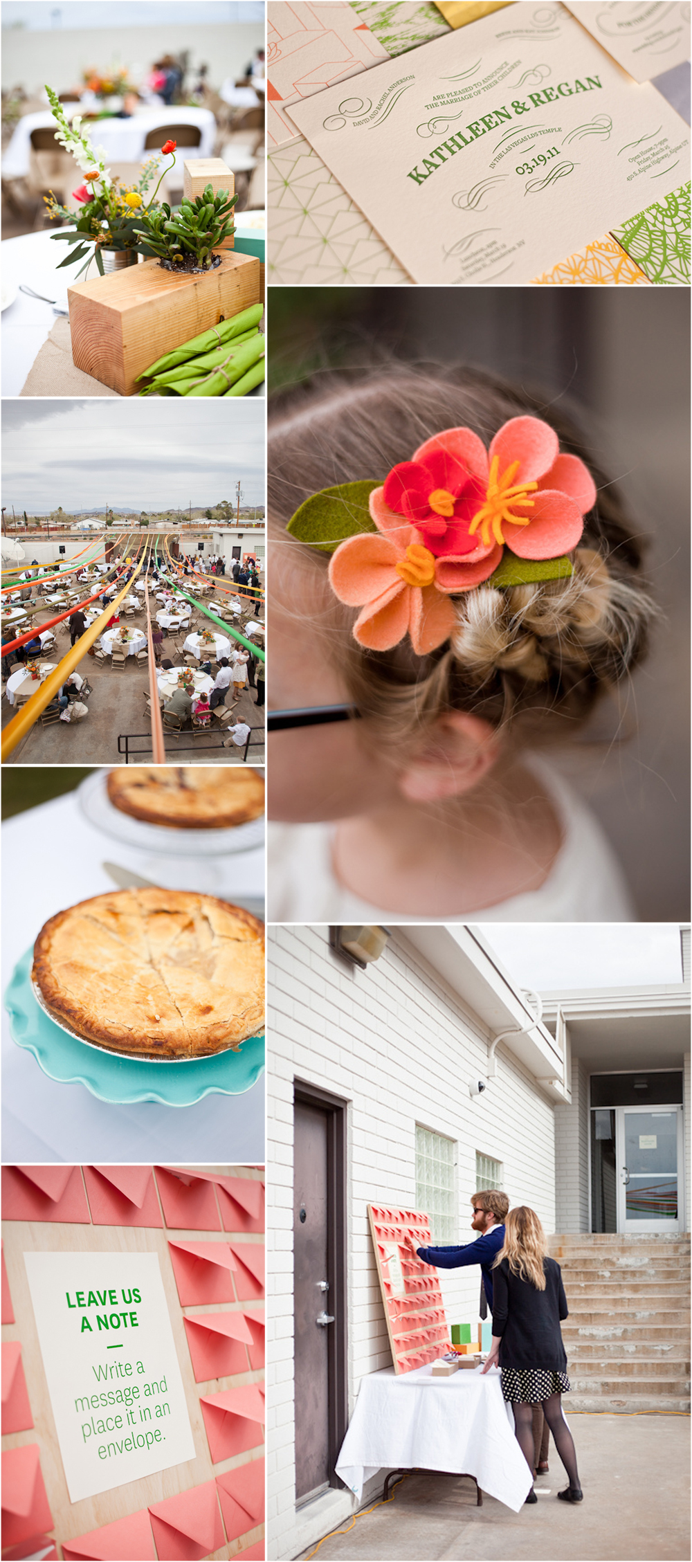 The bride and groom of today’s wedding are graphic designers, and you can see their original touches all across the wedding, from their personally designed letterpress invitations to the handmade-by-a-friend wedding gown. Also – there are pies at this wedding. PIES! I’m sold.