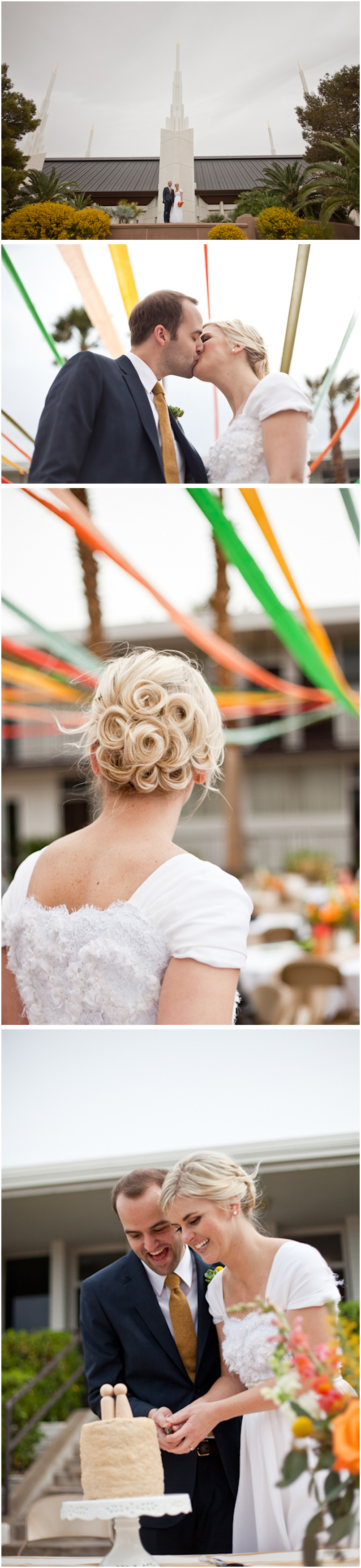 Ceremony venue: Las Vegas LDS Temple / Wedding Photographer: Meg Ruth Photography / Florist: Jill Baugh / Wedding Dress: Hayley Barker / Wedding shoes: Steve Madden / Groom’s Suit: H&M / Groom’s shoes: Zara / Catering and pies: Glenda Nelson / Wedding invitations: designed by groom, printed by Mandate Press