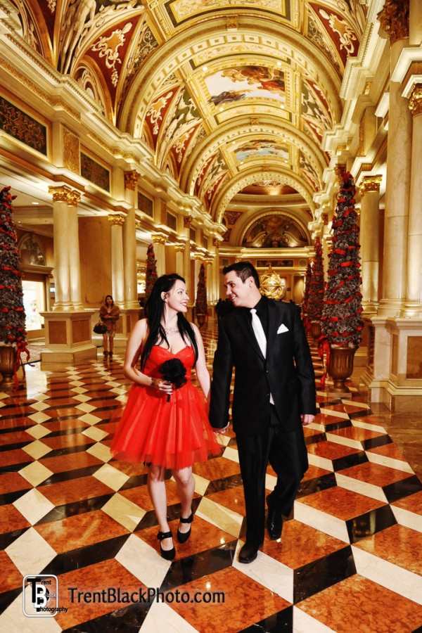 Later the bride put on a vibrant red frock to pose for photos in and around the Venetian. I love the colours – and the coordination with the Christmas decor! :-)
