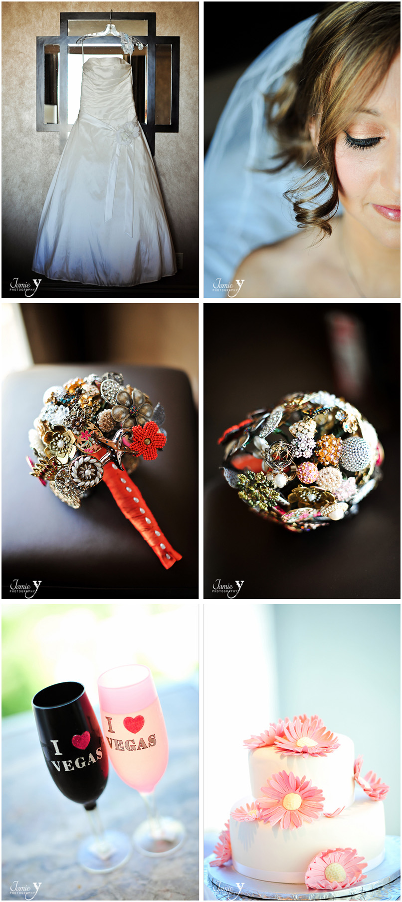 Wedding Ceremony Venue:Â Guardian Angel Catholic Cathedral / Reception Venue: Lunch at Eiffel Tower Restaurant at Paris Las Vegas / Photographer: Jamie Y Photo / “Floral”: Brooch and pin bouquet handmade by bride’s mother