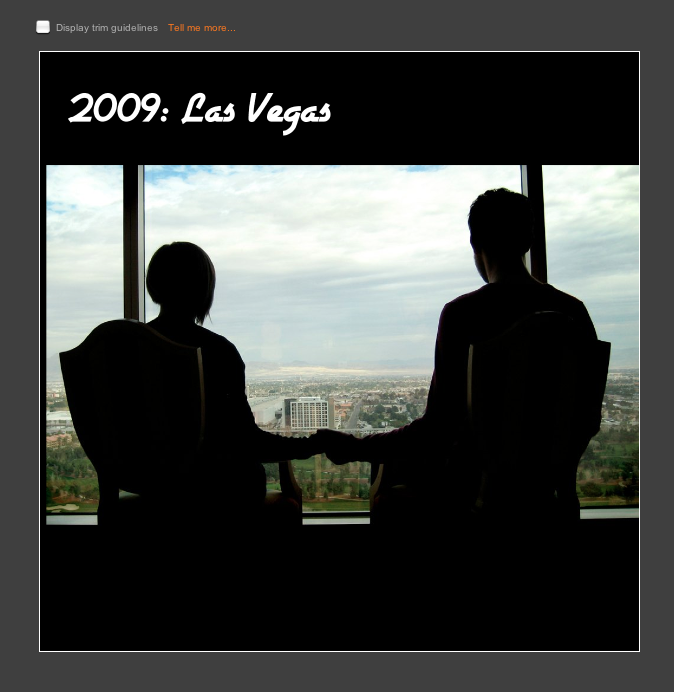 Ever since then, I’ve been itching for an excuse to make another book. With Valentines Day approaching, I got the idea to do a mini-book of photos from all the places my husband and I have spent Valentines Day together, from Thailand to Japan to, of course, Las Vegas. Since he doesn’t read the blog often, I can share a little preview of what one of the internal pages from the 7×7 book looks like as seen in the Blurb BookSmart editor: