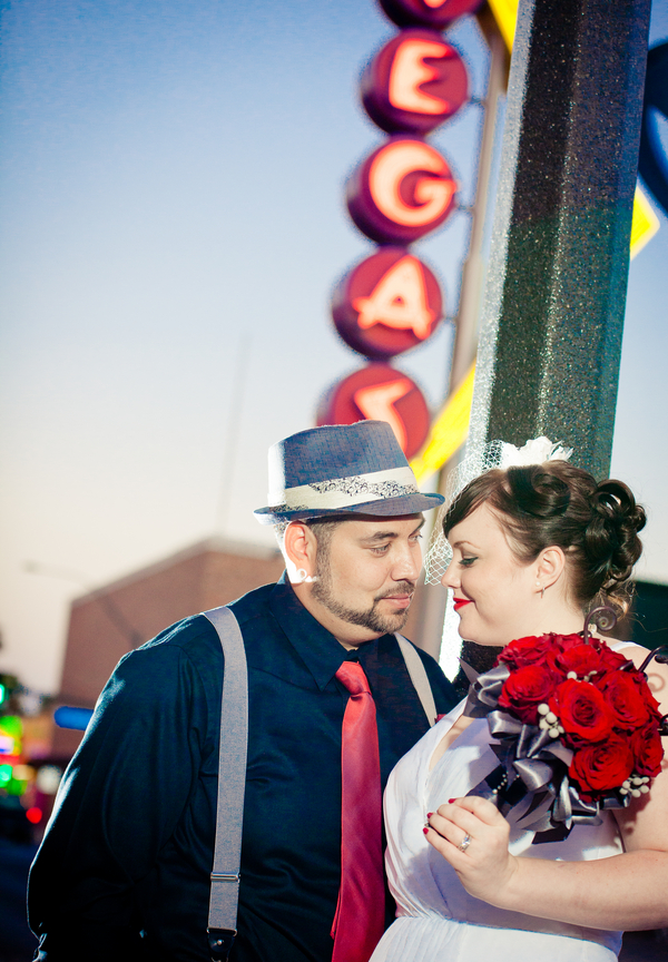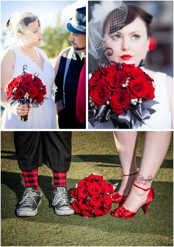 A sharp looking groom in a fedora, tie and suspenders and a flouncy little white number for the bride teamed up with blazing red lippy, a birdcage veil and rad tattoos…match made in heaven!