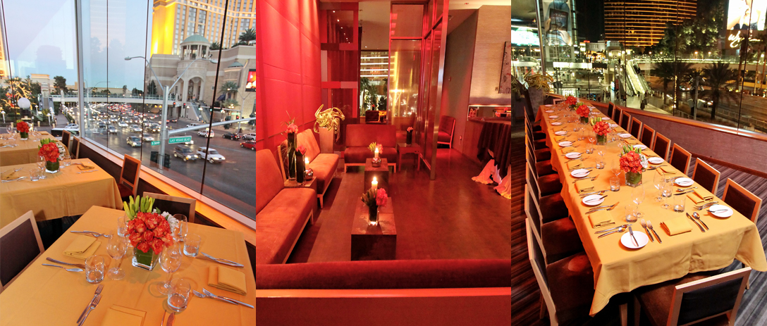 The stunning room with modern furnishings affords a beautiful view of Wynn and Encore, Palazzo and the northern part of Las Vegas Boulevard through over-sized picture windows. The view is the decor here! There are a variety of spaces within that can be combined to the size of the party, including two dining rooms, a red accented lounge and a foyer.
