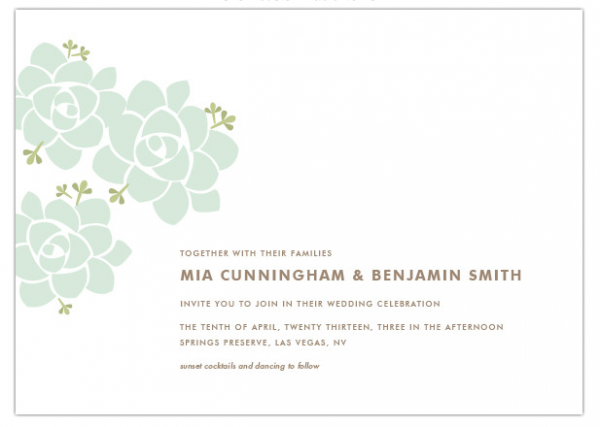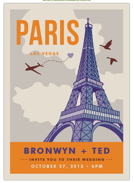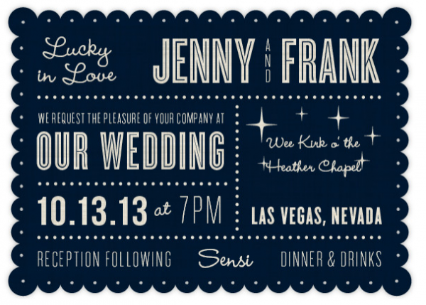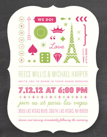 After I had so much fun coming up with Vegas save the date postcard designs, I couldn’t help but make some invitations! Here are a selection of highly customizable wedding invites for Las Vegas weddings from the super fun stationery site, Minted.