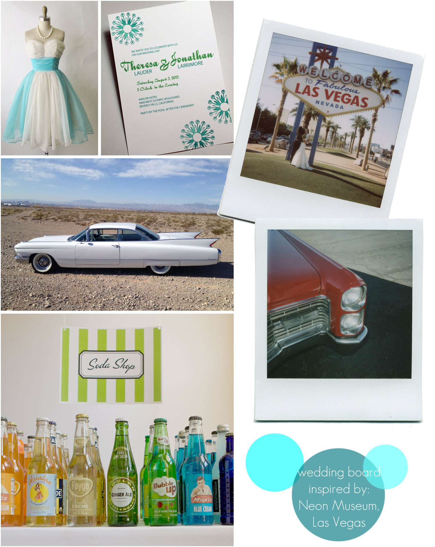 Vintage chiffon tea dress with robin’s egg blue sash by The Vintage Studio // Starburst Atomic Age inspired wedding invitation by Golden Silhouette // Classic finned Cadillac rental car through Las Vegas Fantasy Car Rental // Soda Shop Favours by One Stylish Bride // Polaroid by me!