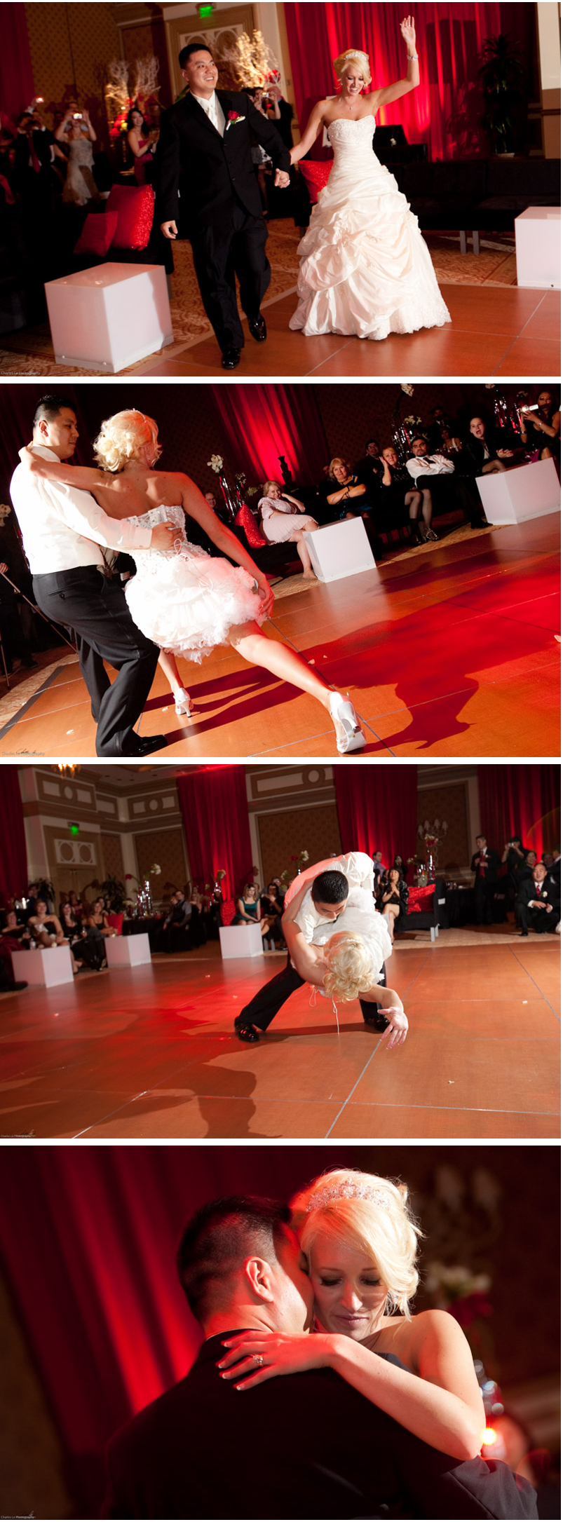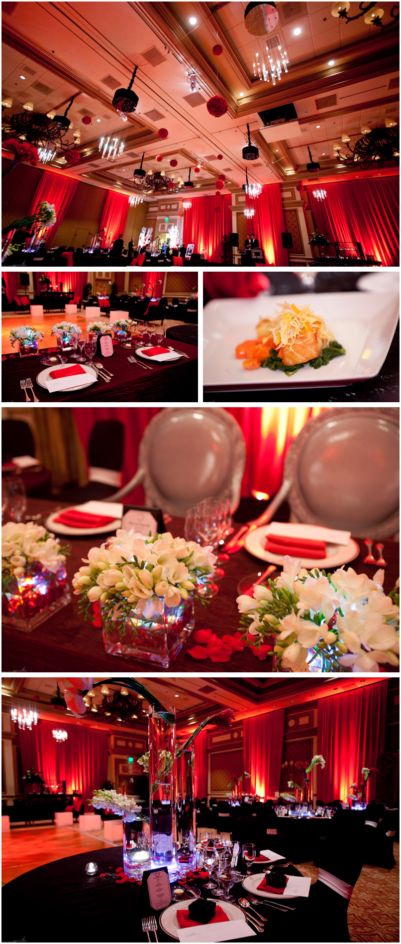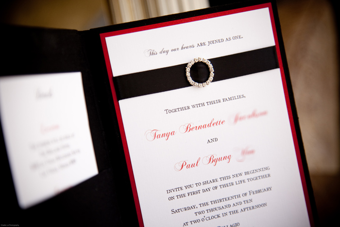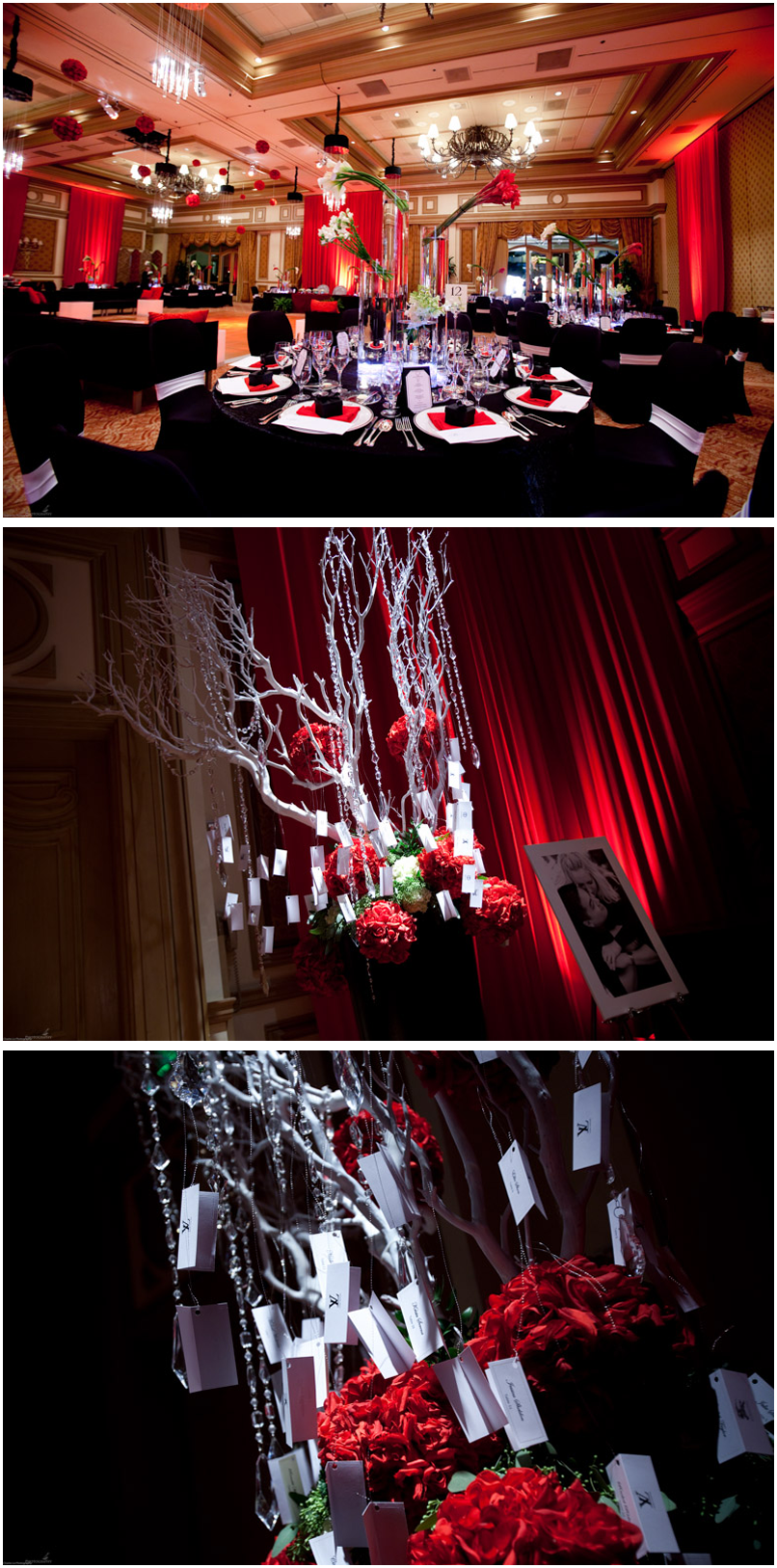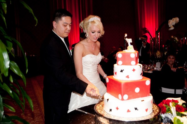 Today’s meticulously planned wedding in red, black and white took place at the Bellagio and was photographed by Charles Le Photography. The wedding (and the bride and groom, Tanya and Paul) took complete care of their guests, entertaining them with a Cirque du Soleil performer, a “Dancing with the Stars” choreographed dance on top of delicious food  and a chocolate fountain as well as beautifully staged decor. Almost all of the work was taken care of by the staff at the Bellagio, from the floral and uplighting to the cakes and linens, after 14 months of thoughtful preparation and choice decisions made by the couple.