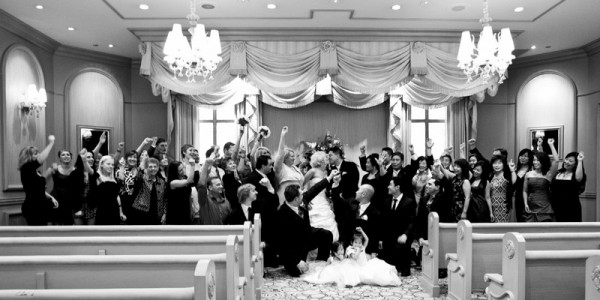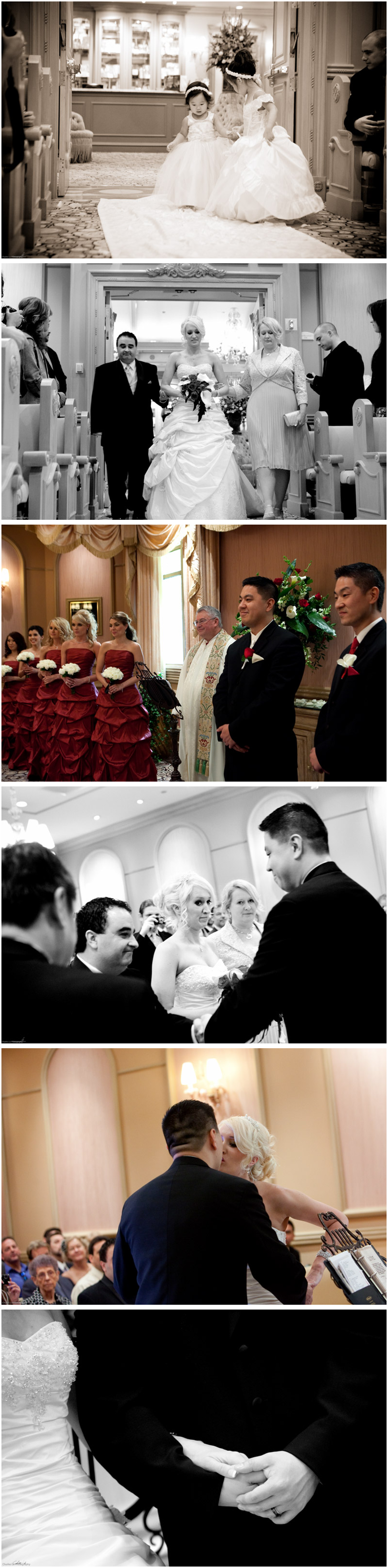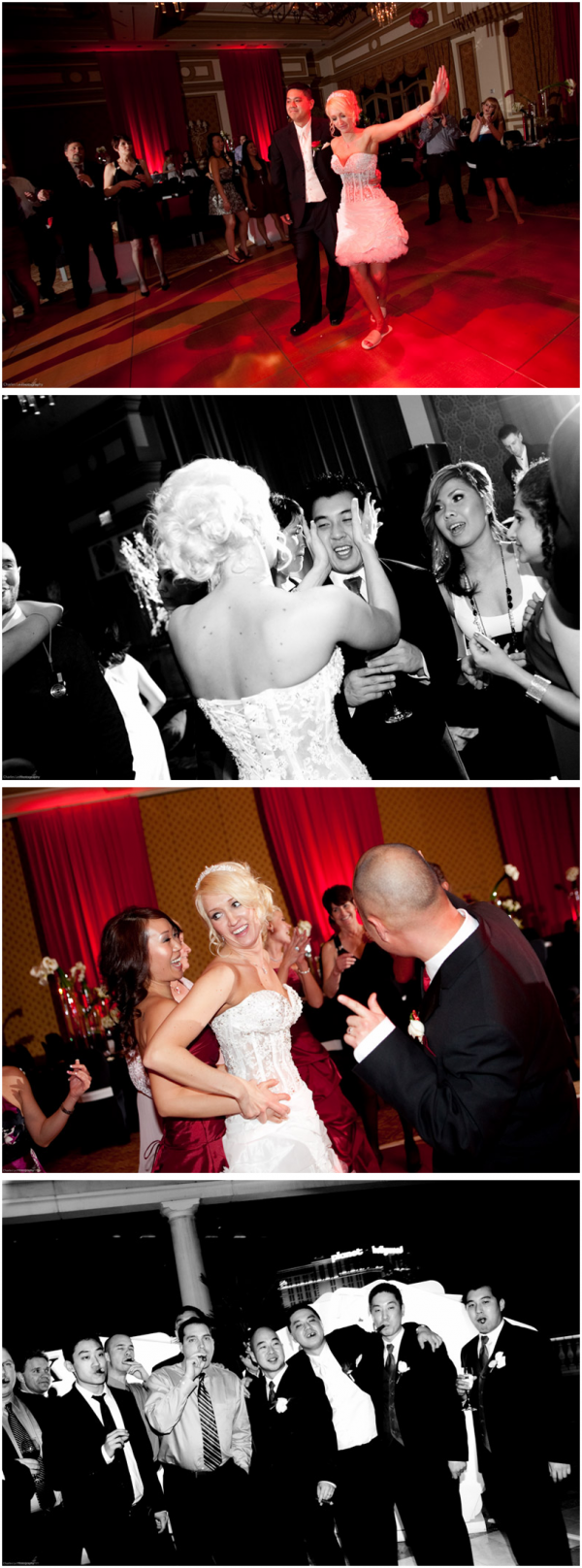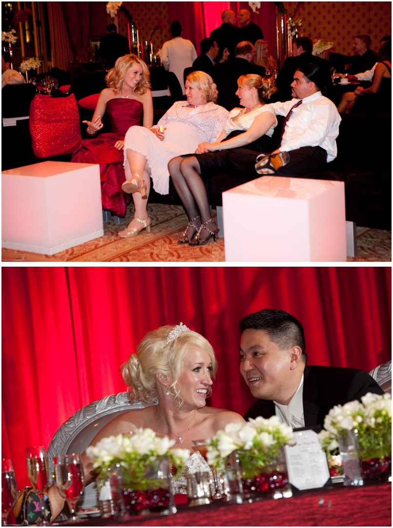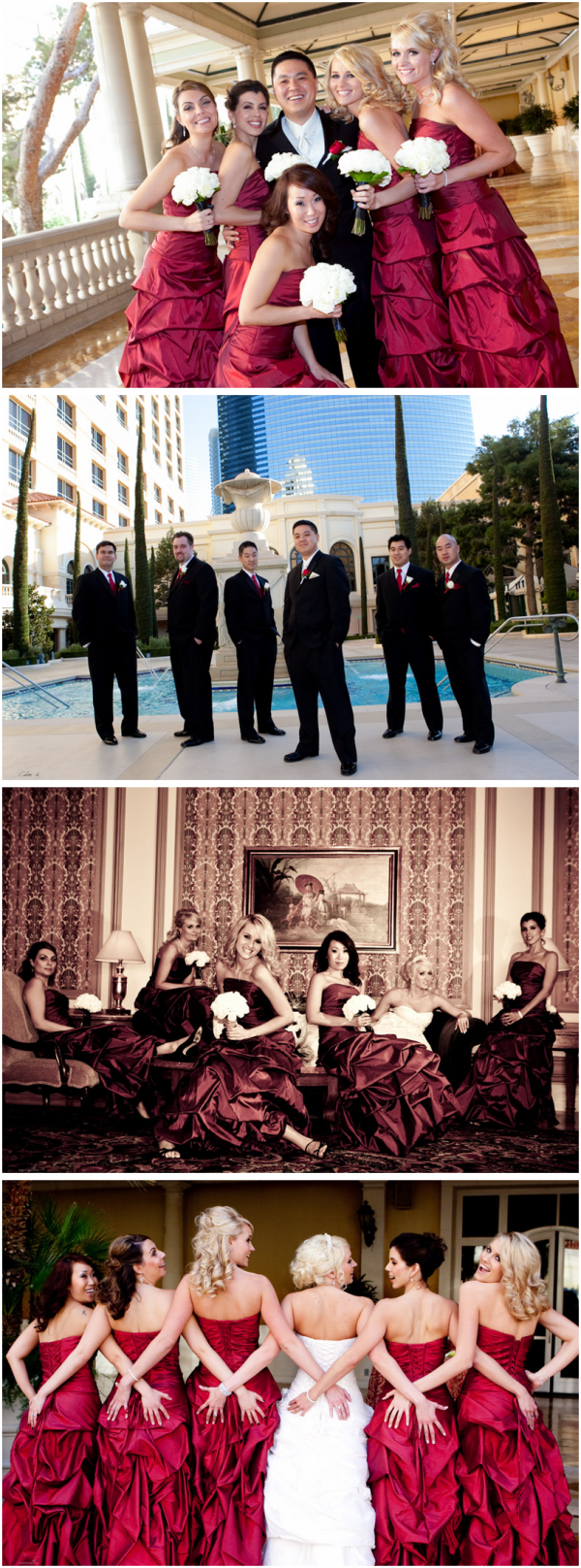 Today’s meticulously planned wedding in red, black and white took place at the Bellagio and was photographed by Charles Le Photography. The wedding (and the bride and groom, Tanya and Paul) took complete care of their guests, entertaining them with a Cirque du Soleil performer, a “Dancing with the Stars” choreographed dance on top of delicious food  and a chocolate fountain as well as beautifully staged decor. Almost all of the work was taken care of by the staff at the Bellagio, from the floral and uplighting to the cakes and linens, after 14 months of thoughtful preparation and choice decisions made by the couple.