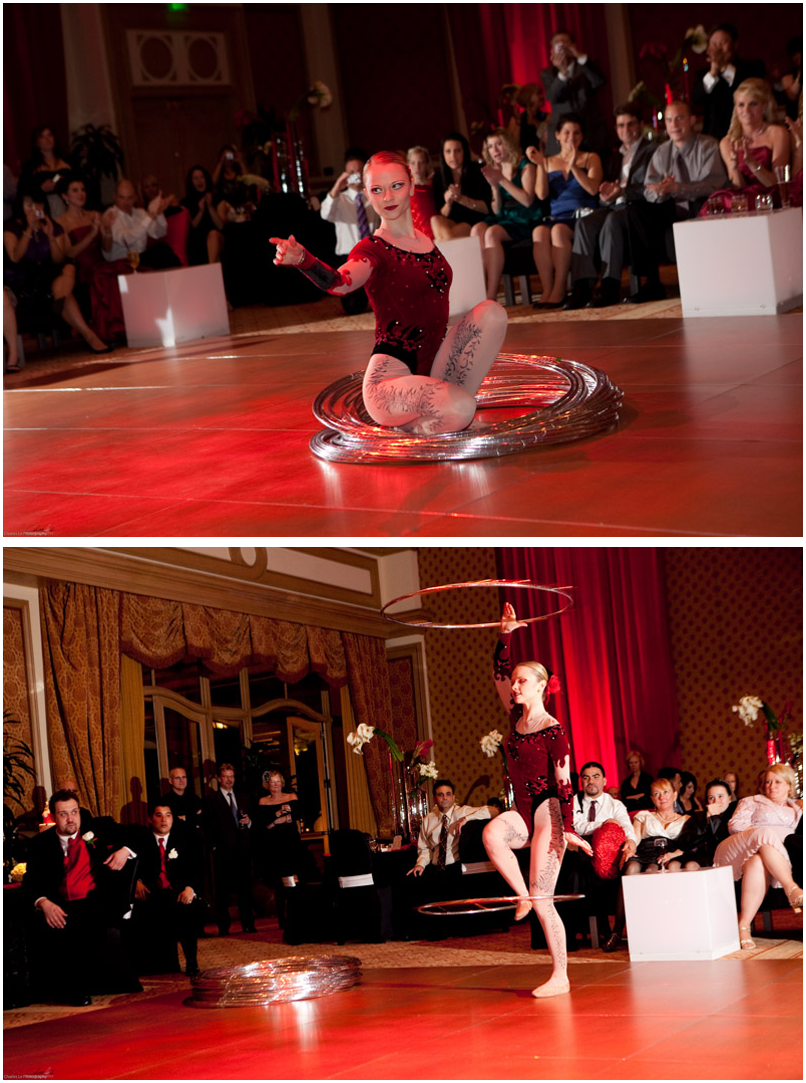 Wedding + Reception Venue: Bellagio / Photographer: Charles Le Photography / Wedding Planner: Jim McCoy and Bellagio staff / Wedding Dress: Maggie Sottero / Tango Dress: Pnina Tornai replica /  Makeup + Hair: Makeup Hair Artistry by Summer Barker / Floral: Bellagio / Catering including Chocolate Fountain and Gelato Bar: Bellagio / Cake: Bellagio / Stationery: Brenna Catalana Rhodes / Linens and Lighting: Bellagio / Choreographed Tango by Bride and Groom: Tony Meredith from “So You Think You Can Dance” / Hoop Performer: Elena Lev of Cirque du Soleil / Card Magician: Bram Charles