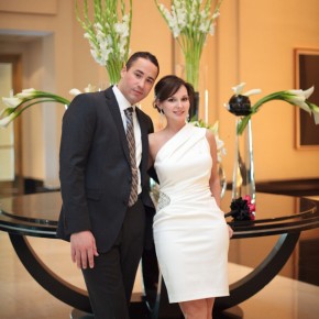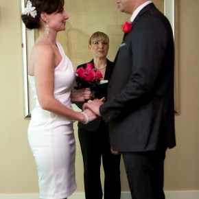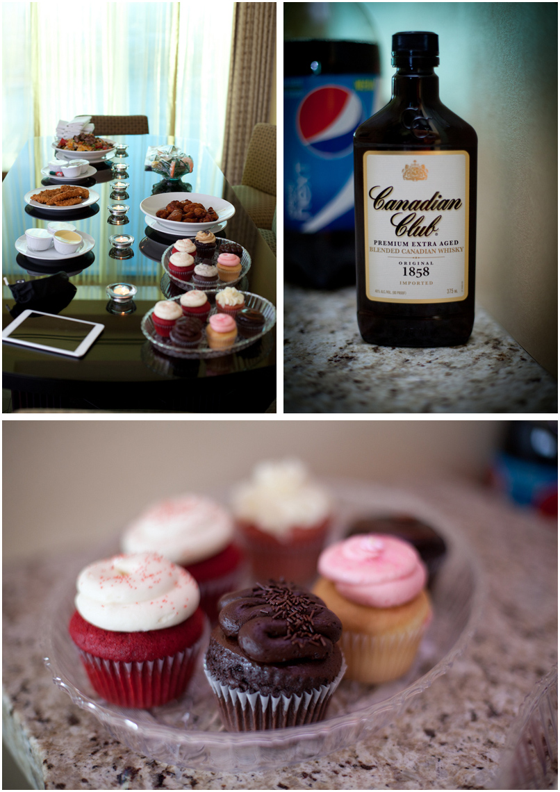 McKenzi of Taylored Photo Memories documented the memories of this special Vegas elopement and shared this chic little in-suite ceremony with me. You might recognize a face at the party too – that’s Angie Kelly of Peachy Keen Unions presiding. Family members unable to make the trip joined in via FaceTime and the internet. Following the ceremony there were cupcakes and candles and Canadian Club. All the good C’s to make a great wedding go down!