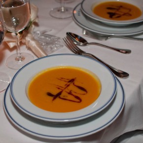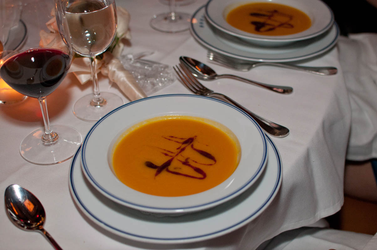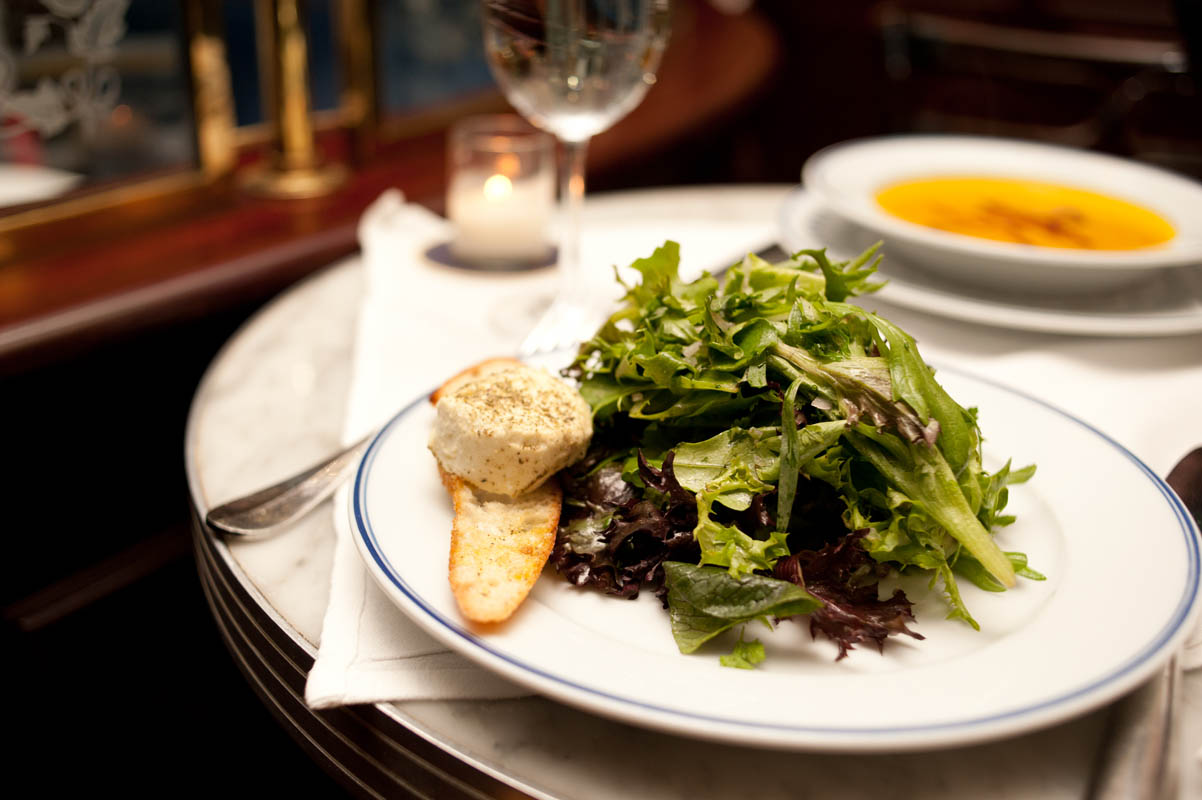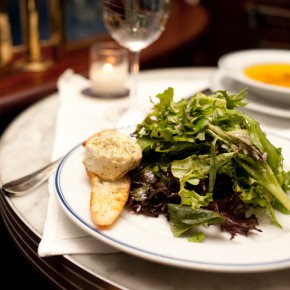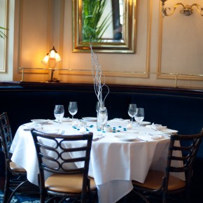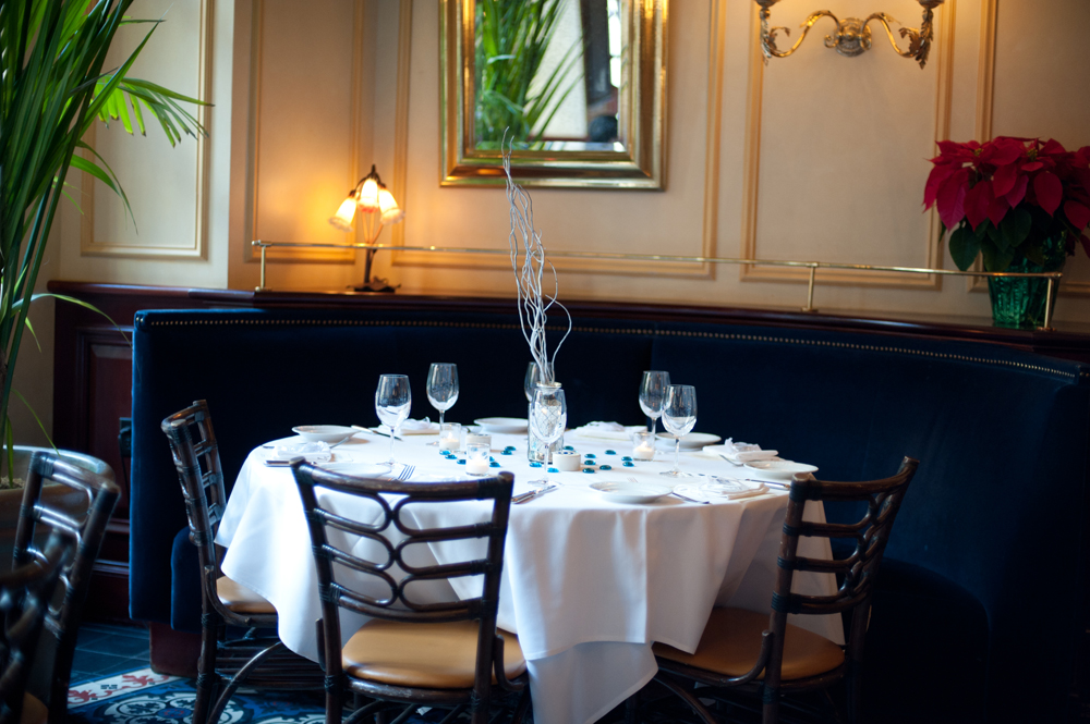 In case you’re wondering (I know I was – I also keep a food blog!) here was the full menu for the meal that was served privately in the main dining room of Bouchon: To start, butternut squash soup with cranberry emulsion or mixed green salad with warm goat cheese, herbes de Provence and a red wine vinaigrette. Main entrees were a choice of sauteed Scottish salmon with farro, roasted squash and beurre rouge or roasted chicken with savory jus along with Brussels sprouts, parsnips and bacon lardons or flatiron steak with pureed potatoes, shallots and maître d’hôtel butter.  Tiny bite-sized mignardises followed then that absolutely immaculate macaron covered citrus flavored gâteau.