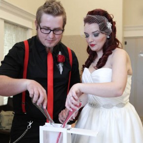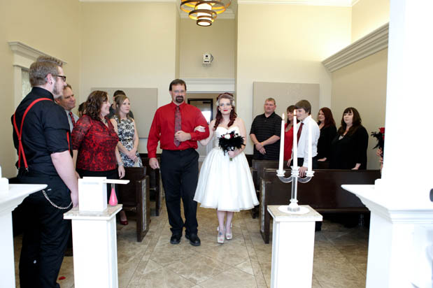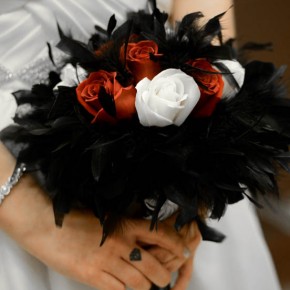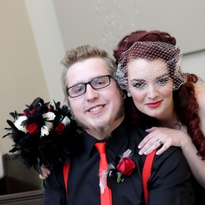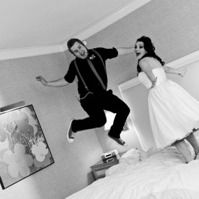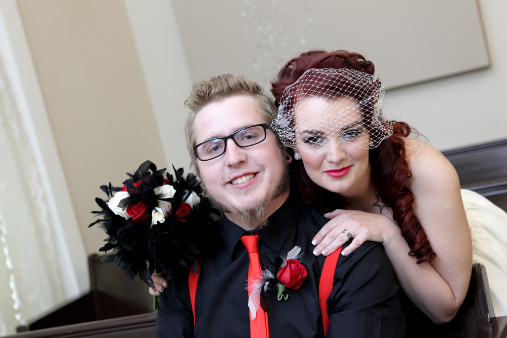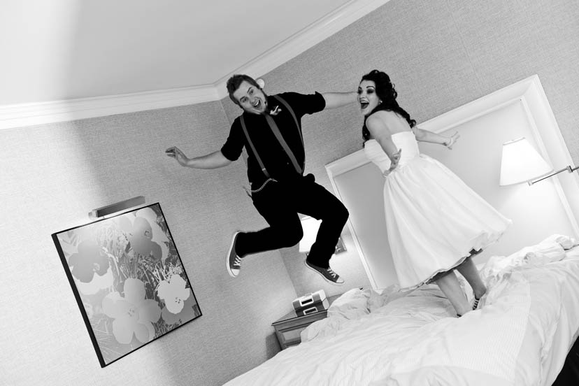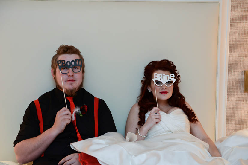 Their photographers, Every Detail (Chapel of the Flowers on-site photography partner) were there for the various photo sessions, including the one of them jumping on the bed and the bridal portraits of Ashley in Little Chapel’s famous red chair – doesn’t she look amazing? Her beauty on the day was completely done by … her! So stunning, and so fun. Love her choice of a black feather, red and white rose bouquet as well. Congratulations!