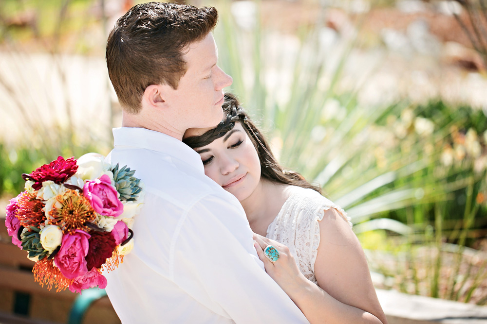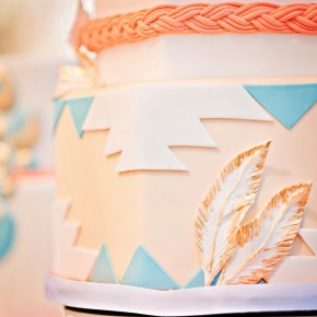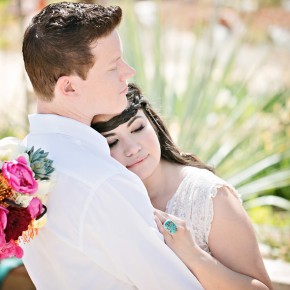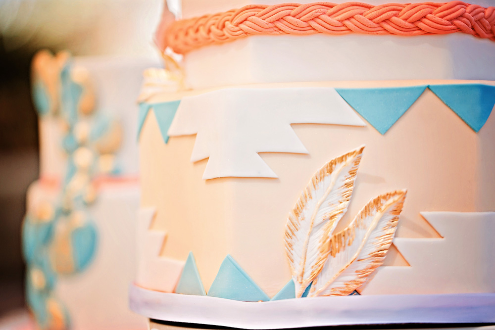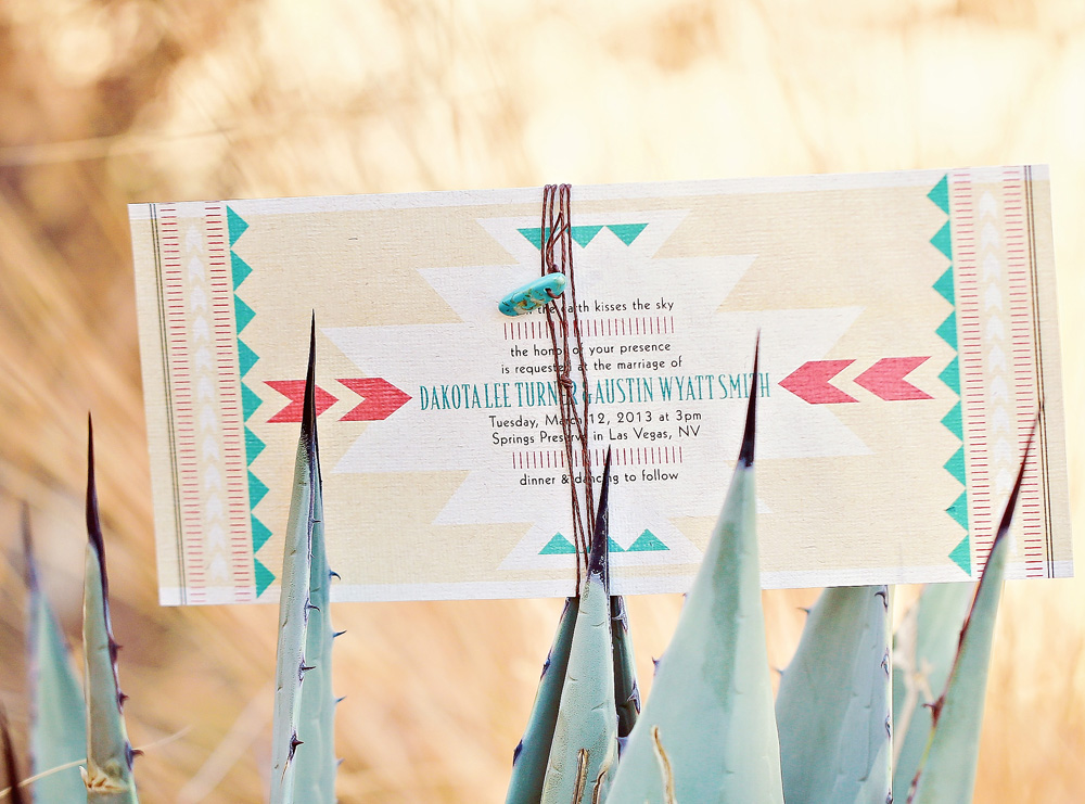 Photographer Megan Vaughan took part in a wedding inspiration/styled shoot that happened at the Springs Preserve in March. This exquisite event, conceptualized by Chelsea LaVere of Orchestrated Shoots and coordinated by Angelica McDonnell of Green Orchid Events had a “Feather and Stone” desert theme, with faded aquamarine and dusty pink tones, strong graphic lines and shapes alongside genuine turquoise stones with feather details for a softer feel. I love the “turquoise” on the cake by Peridot Sweets!