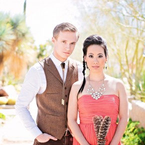 Styled Shoot “Wedding” Venue:  Springs Preserve / Photographer: Megan Vaughan / Styled Shoot Concept and Design: Chelsea LaVere, Creative Director of Orchestrated Shoots  / Styled Shoot Coordination: Green Orchid Events / Videography: Jeremy Mitchell Cinema / Wedding Dress and Bridal Wear: Free People / Jewelry: / Bride’s Shoes: / Bridesmaid’s Dress: Bella Bridesmaid / Groom’s Suit and Neckwear: Tuxedo Junction and Studio Arno /Hair + Makeup: Your Beauty Call /  Floral: Blossoms by Gayle / Cake: Peridot Sweets / Stationery:  The Girl Tyler / Furniture Rentals and Decor: The Wooden Trunk / Dishware and table settings: Dirty Dishes by Alta Sue / Flatware: Every Last Detail / Feathers: Stuff n Feathers of Etsy / Linens: Pottery Barn