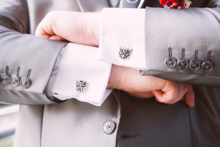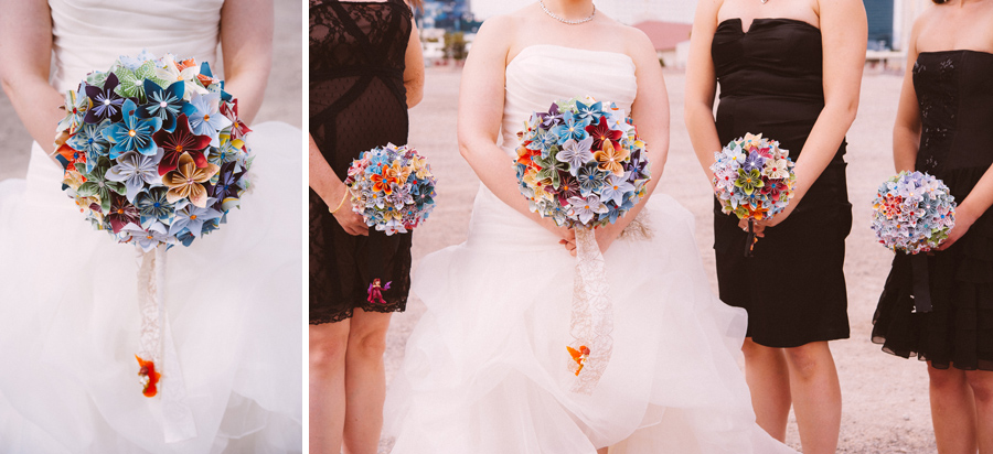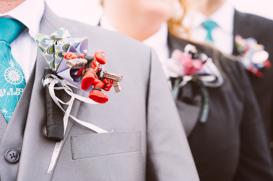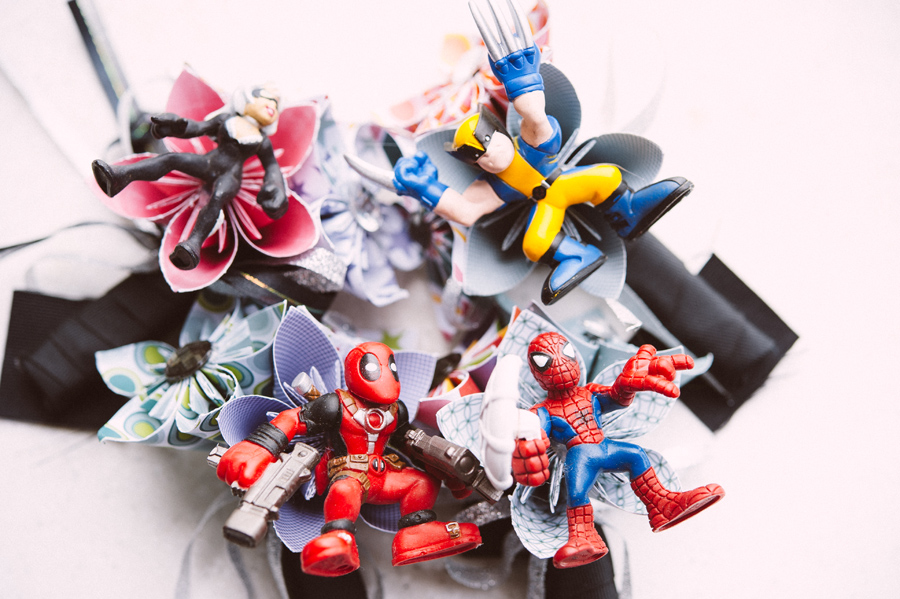 The comicbook-esque paper origami bouquets and boutonnieres with added superhero action figures were handmade by the bride (instructions for the projects can be found here and here) How awesome and funky are they!?