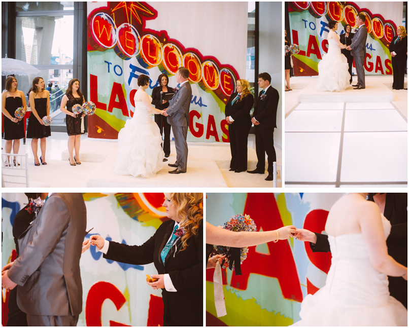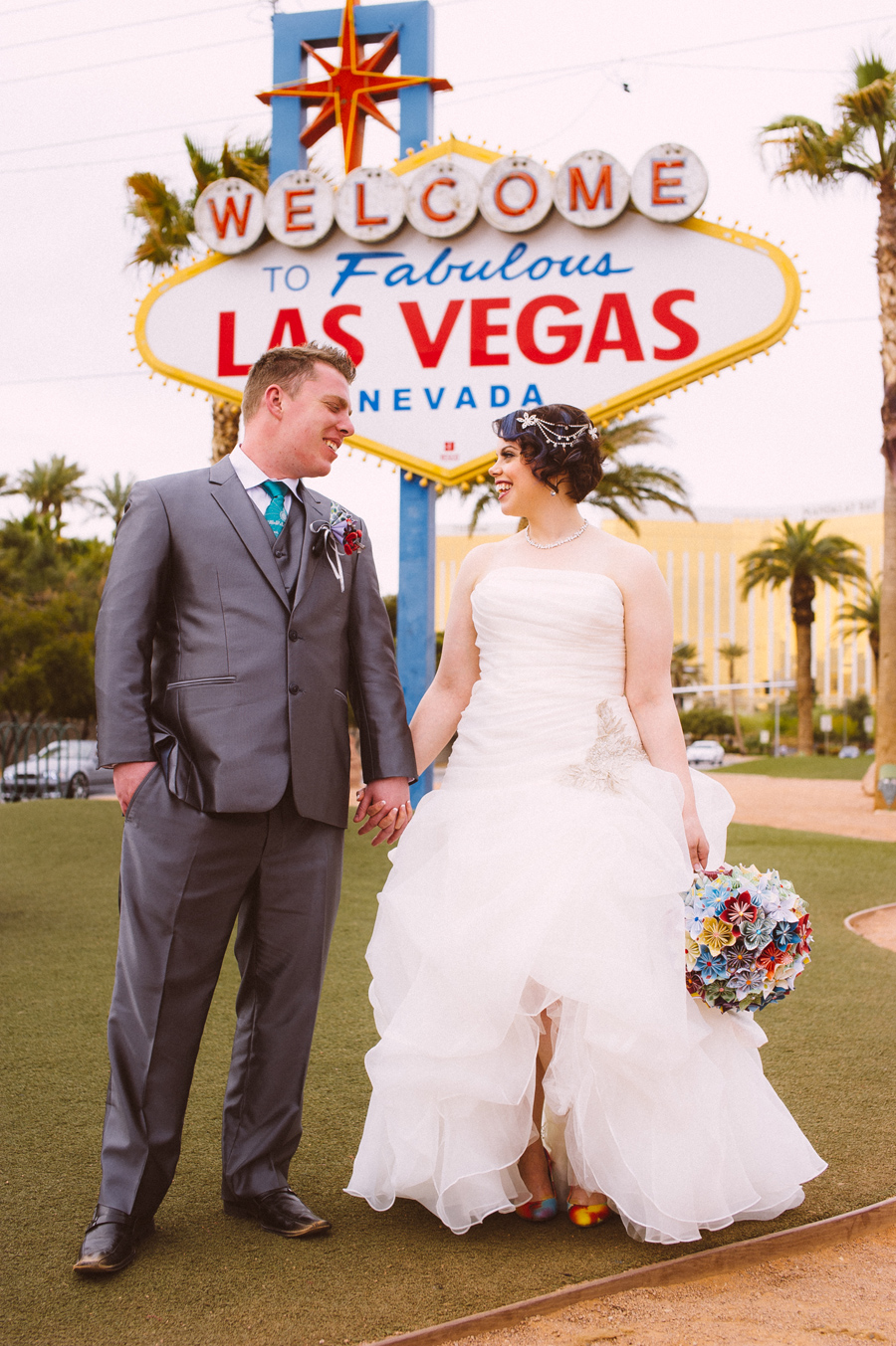 Wedding Venue: Cosmopolitan Pop Up Wedding Chapel / Reception Venue: Firefly* Tapas Kitchen and Bar Las Vegas / Photographer: Mike L Photos/ Wedding Dress: Galina Signature Line from David’s Bridal / Jewelry: “Merry” necklace and “Puzzle” earrings by Swarovski / Bride’s Shoes: “Himber” Pumps by Spring / Hair + Makeup: Harmony Medina /  “Floral:” Hand folded origami paper bouquets, a DIY project by the bride! Instructions  here and here/ Cake: The Cupcakery at Cosmopolitan Pop Up Chapel / Cake Topper: “Vegas BABY!” Custom Wire Cake Topper from heatherboyd on Etsy / Stationery:  Vintage Vegas line from Vintage Wedding Invitations via Zazzle