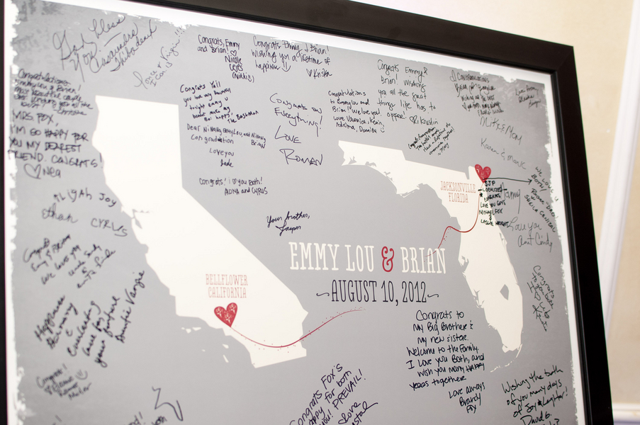 Wedding Venue: Valley of the Falls at Mandalay Bay / Reception Venue: Wellington Place / Photographer: The Emerics / Videography: Moxie Studio / Wedding Dress: Adorea by Soterro and Midgley / Jewelry: Macy’s / Bride’s Shoes: Steve Madden / Veil: USAbride.com / Groom’s Suit: / Groom’s Shoes: / Groomsmen Suits: / Hair + Makeup: Amelia C & Co. /  Floral: Mandalay Bay / Catering: Wellington Place / Cake: Wellington Place / Map Guestbook: Etsy / Stationery {Programs, Fans, Invitations, Stickers}: Gartner Studio at Target, Beau-coup.com