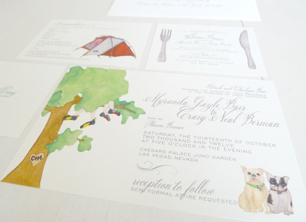 Rock climbing, camping and their dogs – how perfect is this bespoke invitation with watercolor illustrations?Â