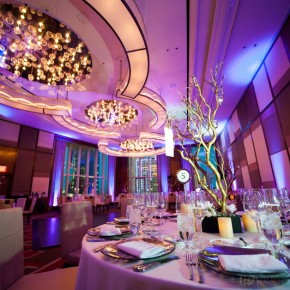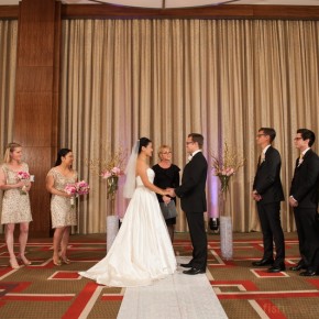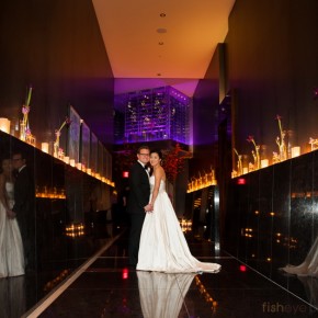 Kyle (from California) and Julie (from Guam) met at university in New York, so it goes without saying that attendees at their wedding were from all over the globe. Las Vegas was the perfect solution because not only being a central meeting spot, but it allowed guests to have a fun wedding weekend. The Mandarin Oriental played a key role in providing the not-too-Vegas wedding that Julie and Kyle wanted. Purple uplighting, golden details and soft floral touches by Flowers of the Field accented this classy affair.