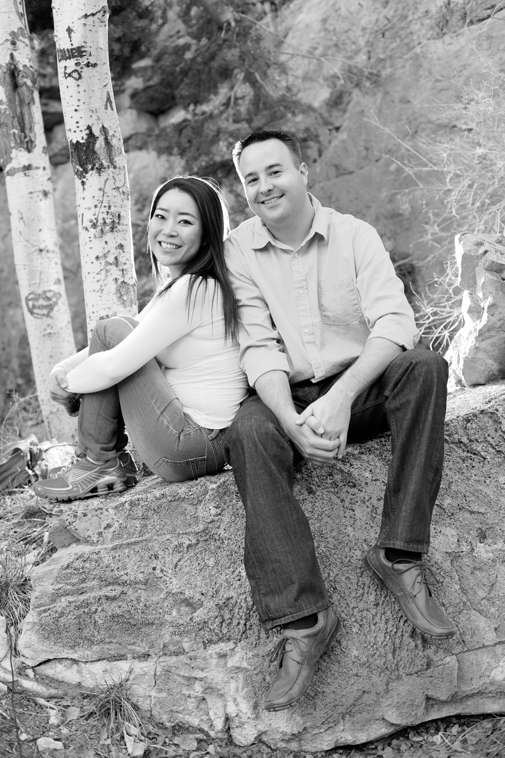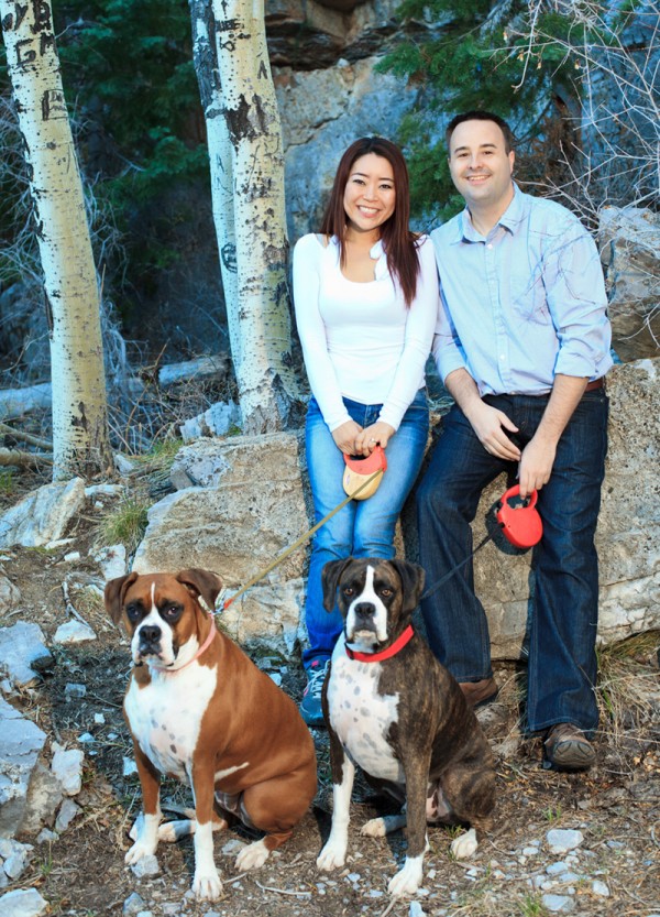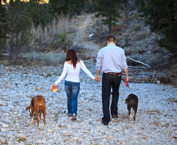 Jim & Jade, the couple, are Vegas locals who met through work, and decided to get some engagement photos done with their two beautiful boxer dogs. Although they are not having their wedding in Las Vegas, they enjoy hiking in the area, and so it just seemed like a perfect spot for them to get a few photos done before their wedding. I love it so much when couples just do what they love for engagement sessions – they look so happy and relaxed!