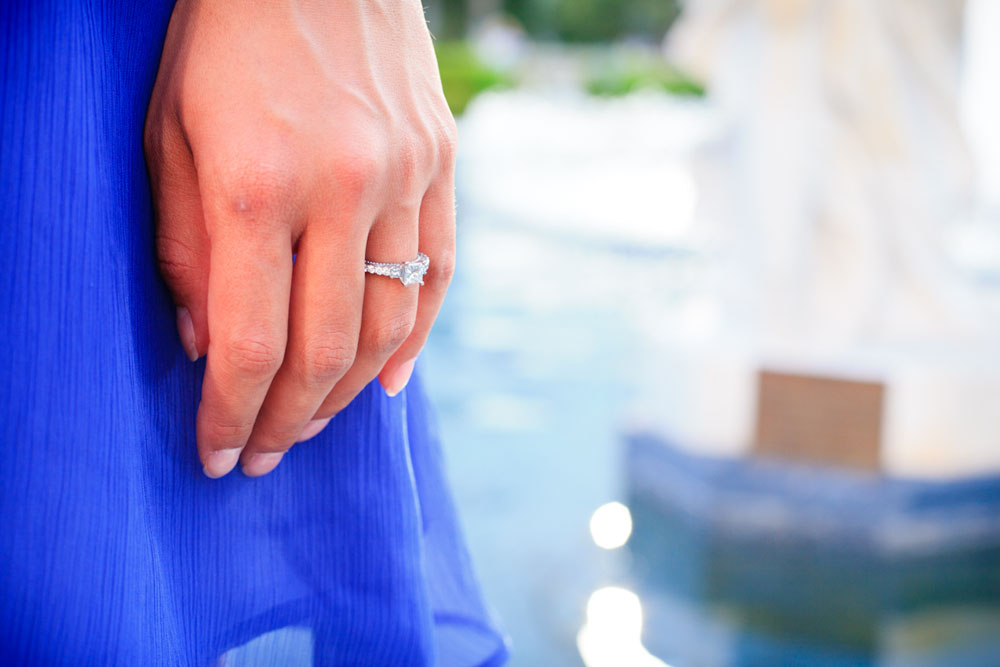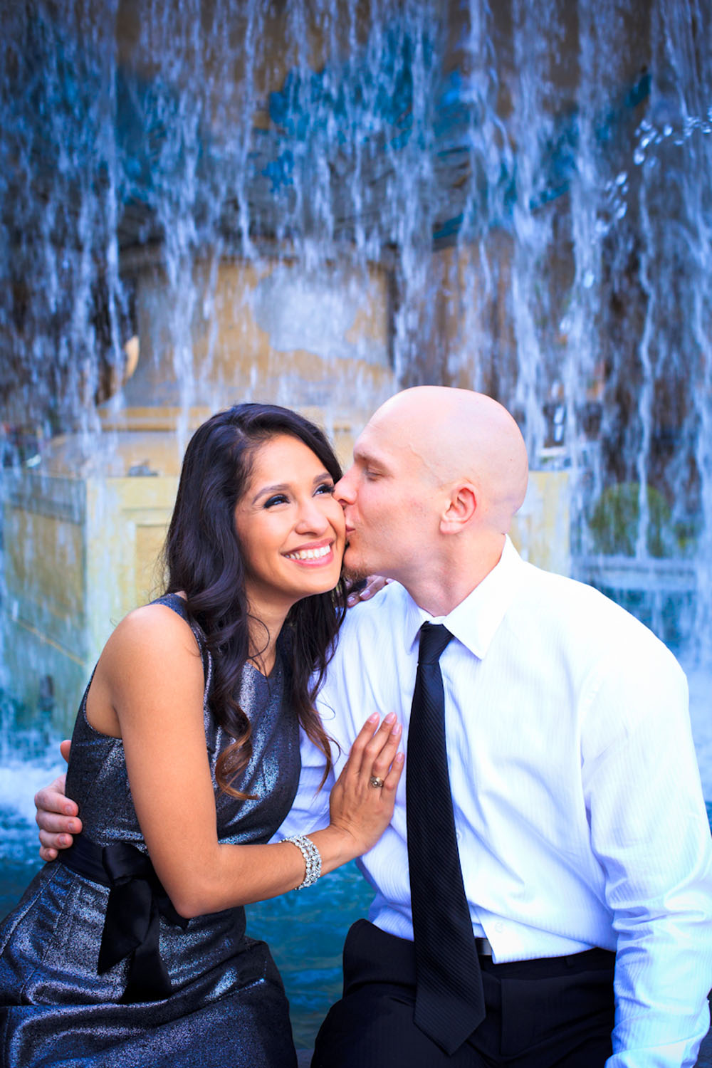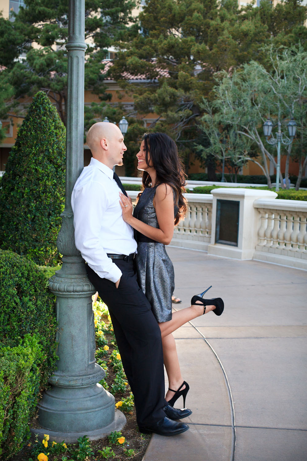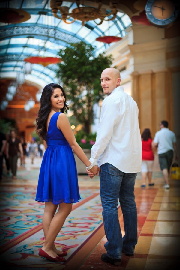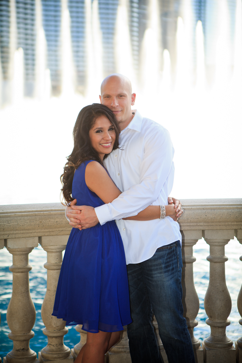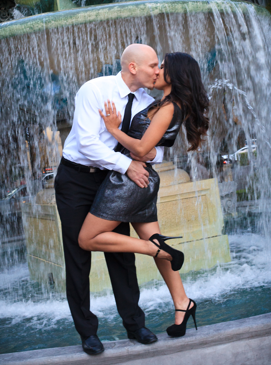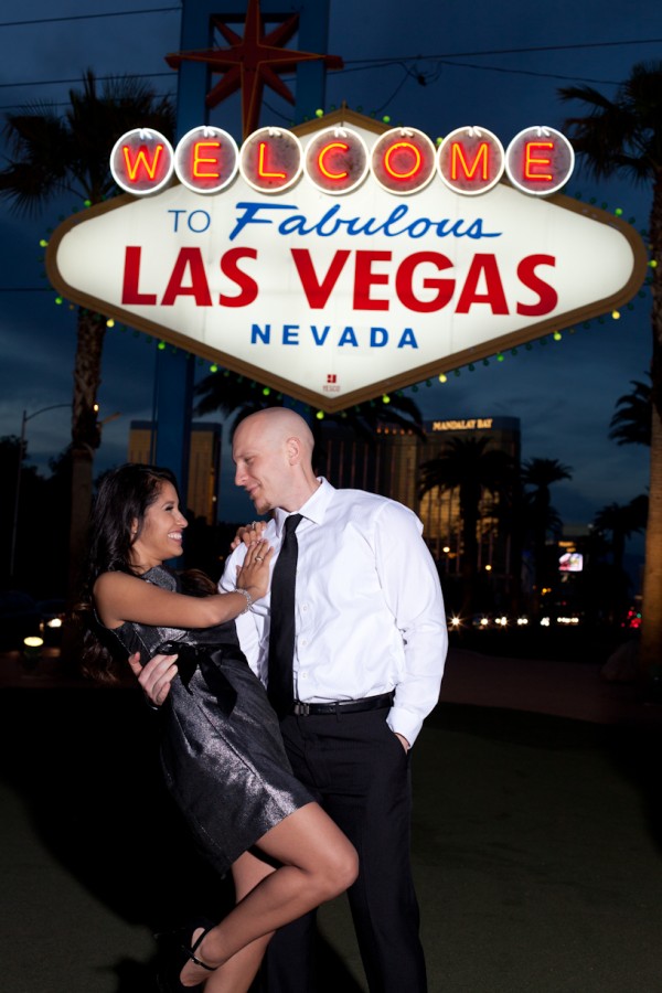 Several different locations and a change of outfits (one cute and casual, the other a little more glammed up) give this session a lot of variety and the couple a lot of choice in their photos – fountains, architecture and gardens are all featured. And Yvette brought her best accessory along with her on the shoot: her dazzling smile! They sure covered a lot of ground during the shoot… starting from Bellagio they worked their way north posing at a few different hotels, then drove down to the Welcome to Fabulous Las Vegas sign, wrapping up there.