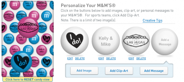 But wait – is that not custom enough? On the third floor is the Personalized Printing station to get your names, wedding date, the Las Vegas sign or other premade icons like a deck of cards, wedding bells, champagne bottle…. even your photo. They will also print text that will fit on 2 lines of 8 characters each, all printed on your M&M’s while you wait. You can try it out online, but picking up in store means no more paying or waiting for shipping – just get it done when you get to town!