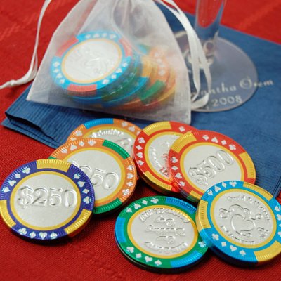 I am really fond of Beau-coup.com’s awesome custom Vegas wedding favors. They carry a lot of standard customizable wedding favor fare like keychains, mints, candy, coaster, cookies, wine stoppers with a Vegas or casino theme. They also sell more Vegas-y themed favors like playing cards, miniature slot machines, poker chips and dice. Almost all of their items are customizable, and they are pretty affordable with low minimums.