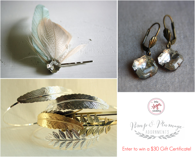 To Enter:Â You can enter this contest up to four times! Use the widget to make entering easy. Enter once by checking out Pomp + Plumage’s full lineup and come back to comment below on what your favorite item is. The Athena headband? Honeycrisp boutonniere? You also get entries for liking Little Vegas Wedding and Pomp & Plumage on Facebook, or tweeting about the giveaway.