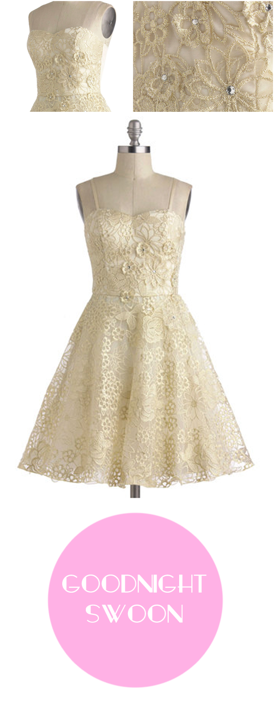 Goodnight, Swoon is a 3D floral lace minidress with sweetheart neckline, full skirt and detachable straps. It’s a warm cream color and features little glinting rhinestones to add a bit of glimmer. Perfect to glide down the aisle in at just $97.99