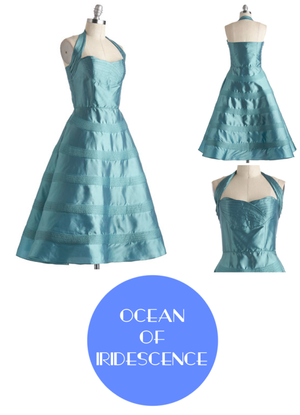 Creamy seafoam Ocean of Iridescence has a beautiful 50’s fit and bodice … couldn’t you see Sophia Loren wearing this? This unexpected retro gown is $69.99