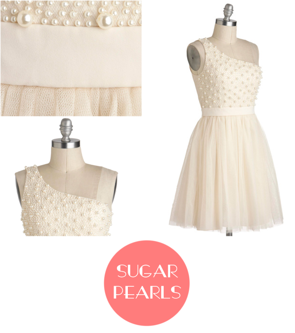 Dainty pearl detailing tops layers of soft tulle in the skirt, with a bit of a modern spin on a very retro look with the one shoulder strap. Sugar Pearls is $84.99