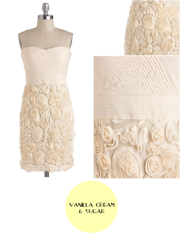 OK, I admit it. This dress totally reminds me of the afterparty dress I rocked at my own Vegas wedding. (Check it out!) The flowers look a lot softer and the pleating on the top is way more detailed than my version, though! Vanilla Cream & Sugar is available for $99.99.