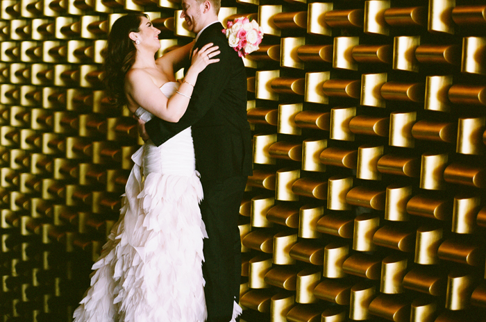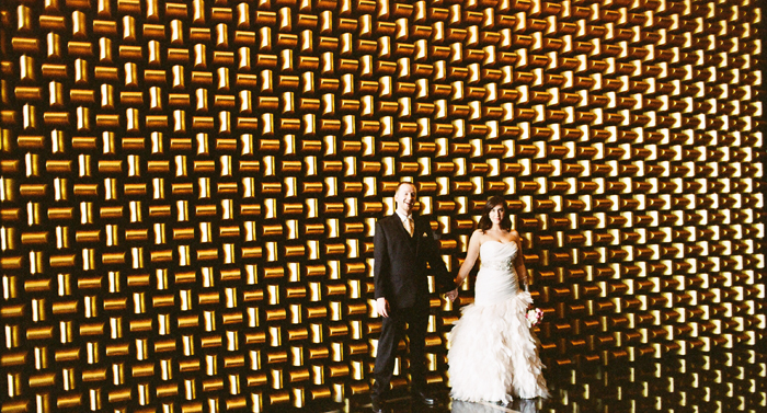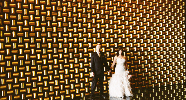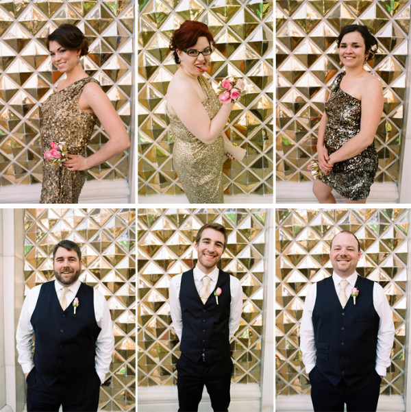 The colors are fabulous in this set. Gold tones seen in the bridesmaids rocking it out their asymmetrical sequined minidresses to the geometric gold background at the Golden Nugget to the 3D gold wall at the Mandarin Oriental. And there’s pink: a faded Miami pink from the photos at the Fun City Motel – a new twist on retro Las Vegas photos. Don’t forget the peek of baby blue suede shoes under Chelsea’s petally bridal gown, either!