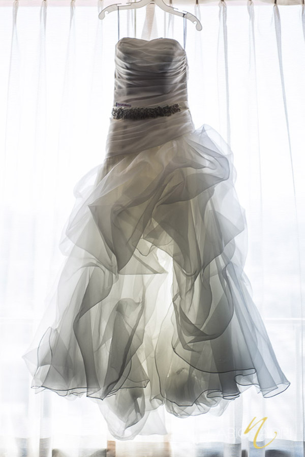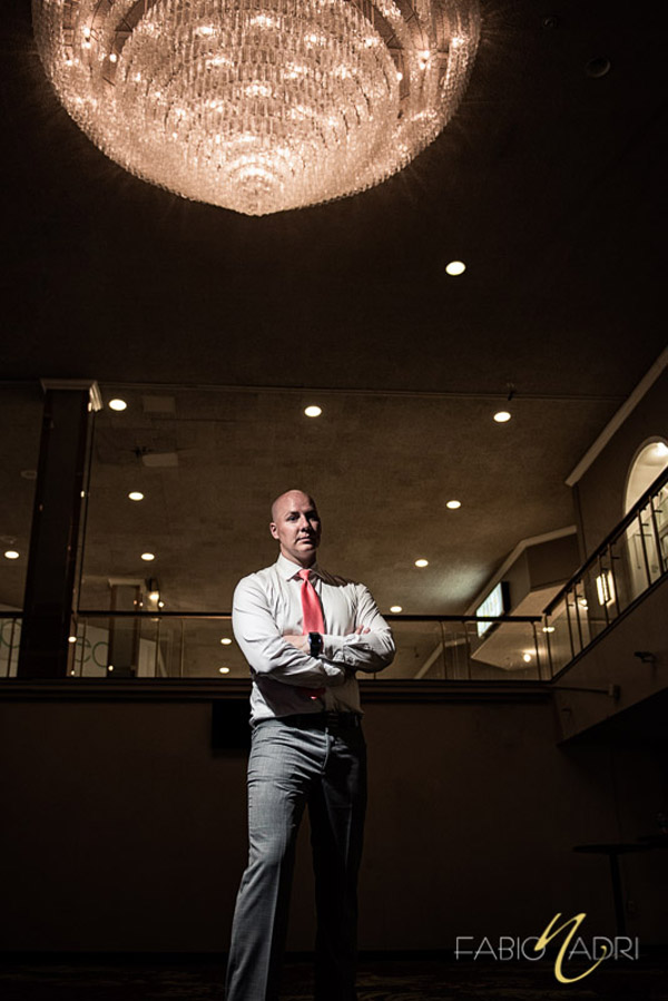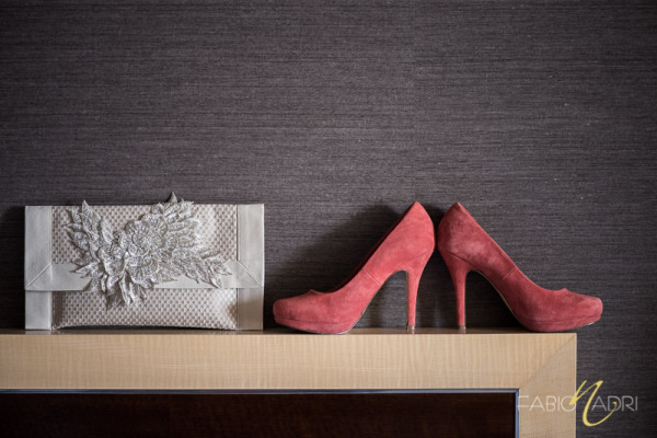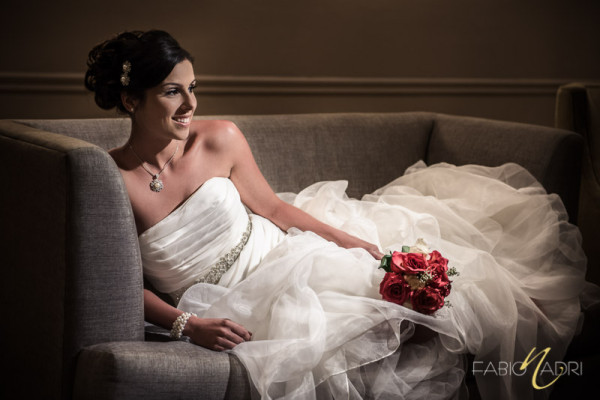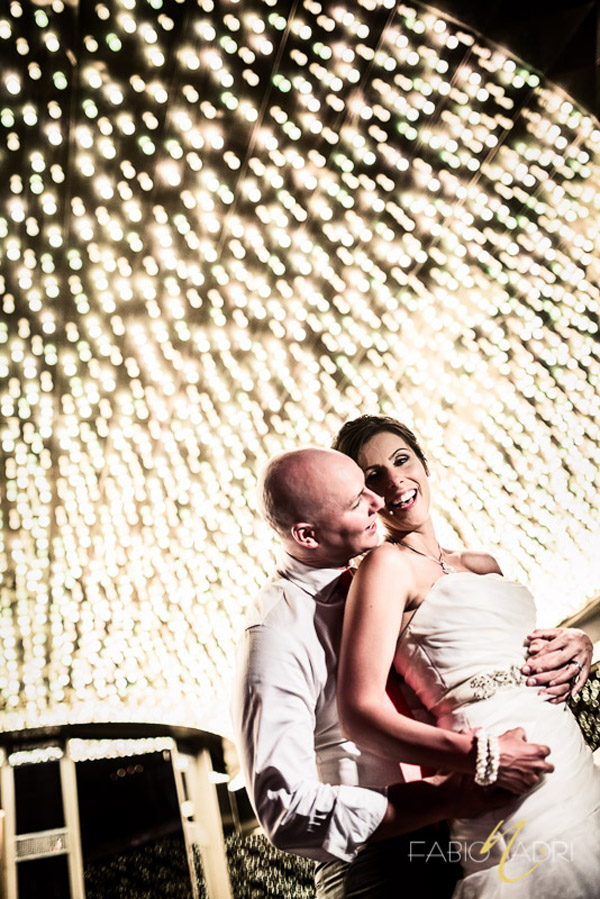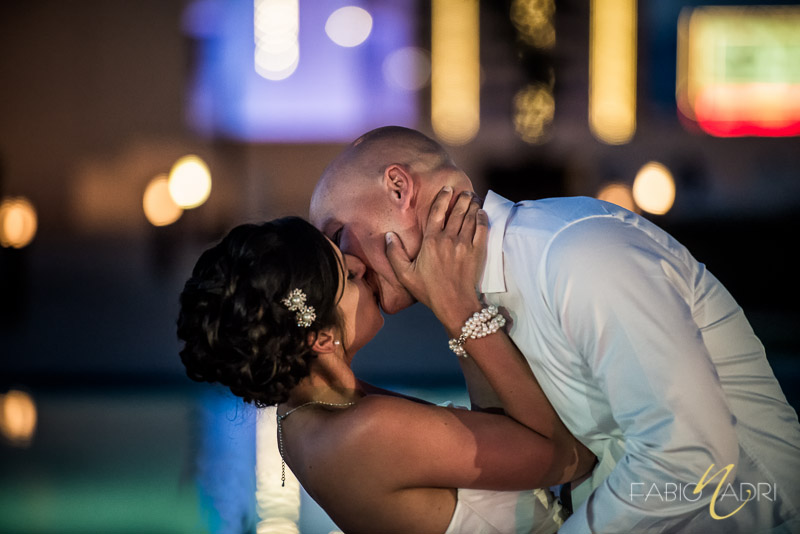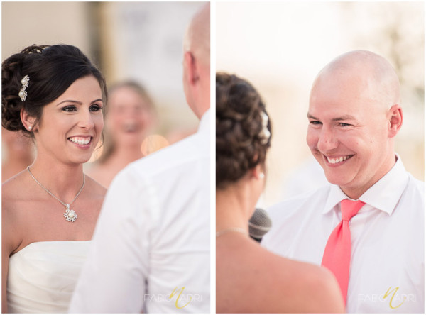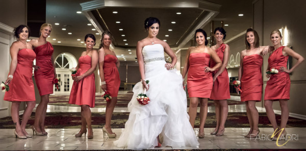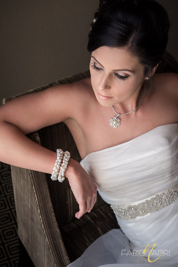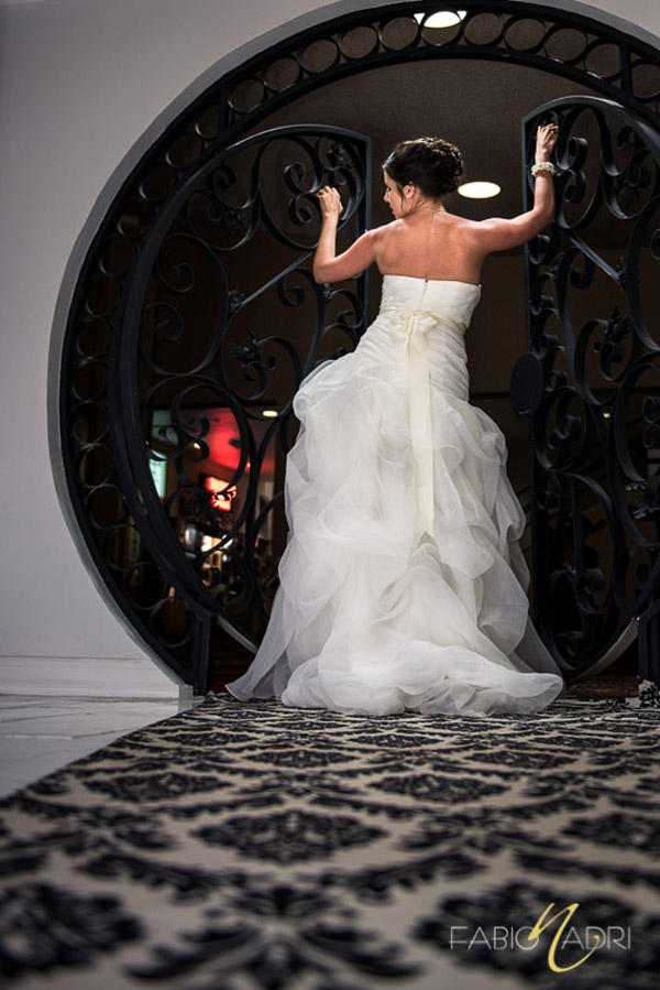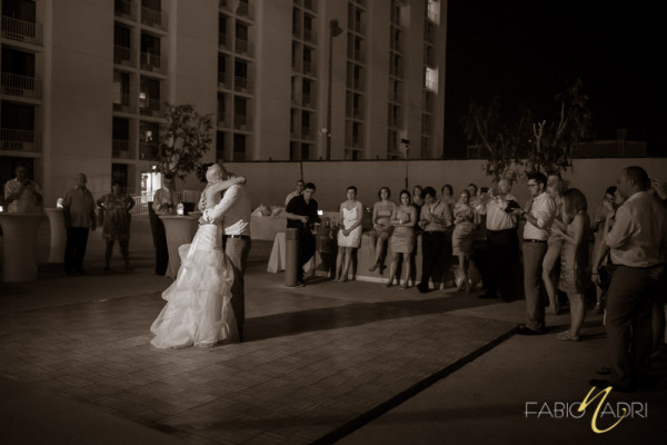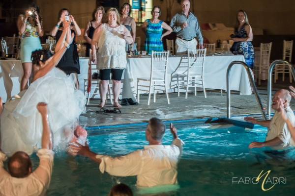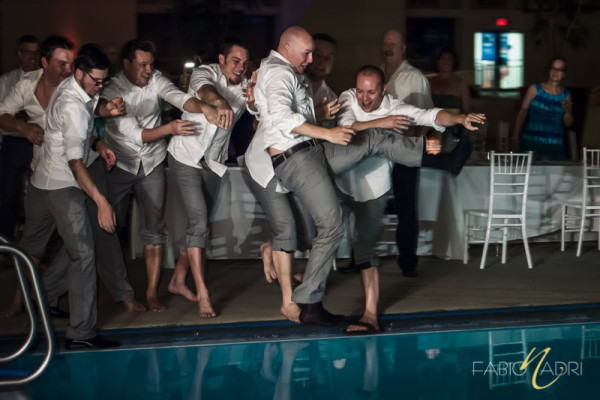 Inspired by her bright guava colored shoes, Stephanie and Adam kept the colors light and bright for their theme. Hurricane lamps and pillar candles lined the fabric aisle runner for their ceremony and as the party moved into the wee hours, Moroccan style lamps lit the night. Later on things got a little crazy, and the new husband and wife plunged into the Plaza’s pool along with their bridal party.