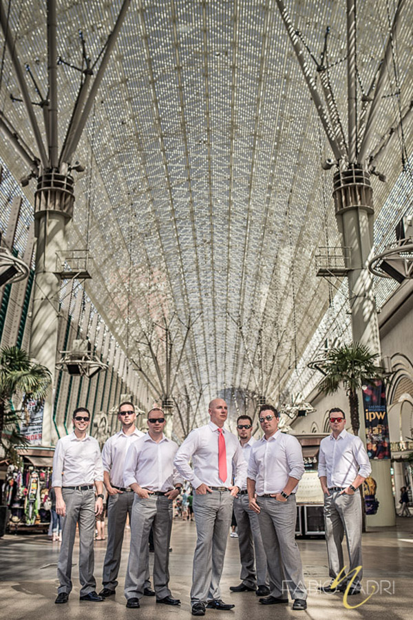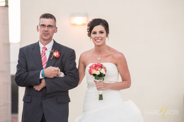 Stephanie and Adam’s amazing wedding ceremony under clear skies on the rooftop of the Plaza Hotel in downtown Las Vegas is featured today! Photographed by the husband and wife team of Fabio & Adri Photography, you’re going to love the tropical guava and coral colors, sparkly details and the pool party that ended the night.