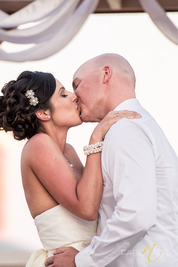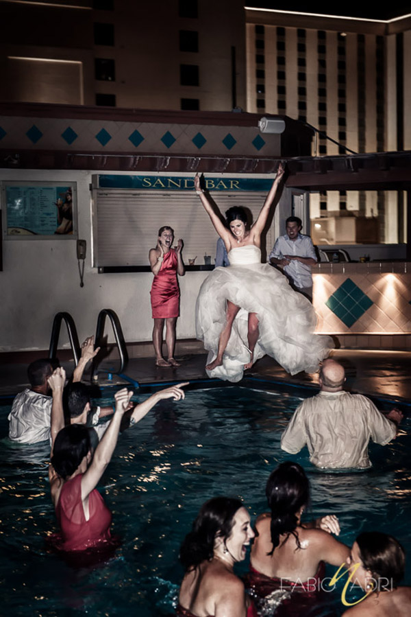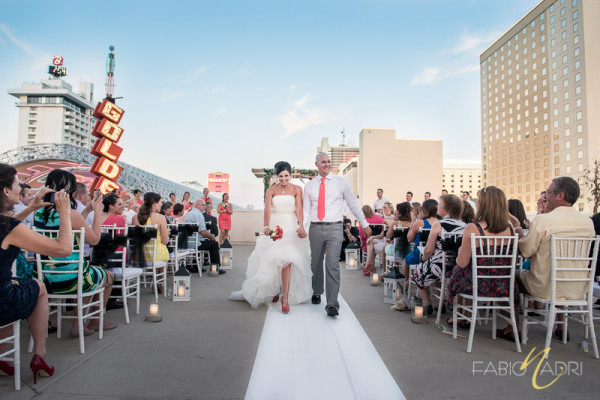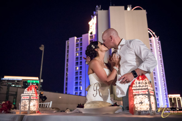 Photographer: Fabio and Adri Photography / Wedding & Reception Venue: Plaza Hotel & Casino Rooftop Pool /  Wedding Coordinator: Regina Padilla of the Plaza / Wedding Dress: David’s Bridal / Hair + Makeup:  Exposed Salon / Catering: Plaza Hotel / Cake: Plaza Hotel / Celebrant: Reverend Daniele Ledoux of Elegant Vegas Weddings / DJ & Entertainment: All Night Long / Photobooth: In A Flash