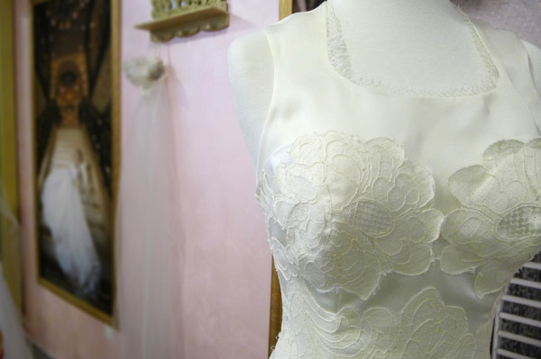 Because she can be, Megan said she is choosy with source materials. She carefully selects Venetian and French lace, Russian tulles, Dupioni silk and other textiles at market twice a year. She lets me touch a few samples – the fabrics are soft, delicate and … sensual. If the dress is in need of a bit of embellishment, high quality crystals and beading are sourced and handsewn.