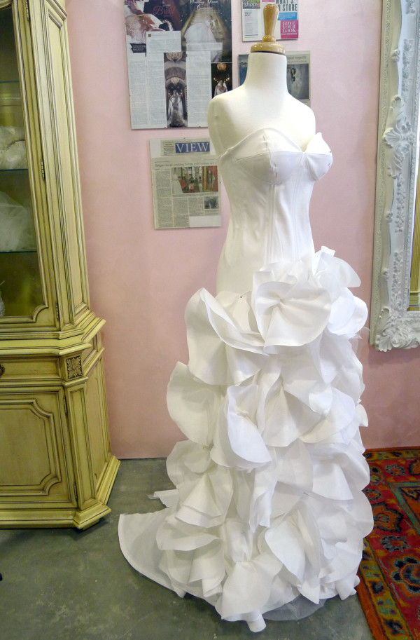 Megan asks questions about the wedding’s theme, personal style, likes and dislikes. A sketch and design (sometimes a few) are created from this discussion, and then a mock up muslin cotton gown for the first fitting and finally the real deal. I get a sense that Megan thrives on the unusual and unique – she really lives to create a true one-of-a-kind piece of fashion.