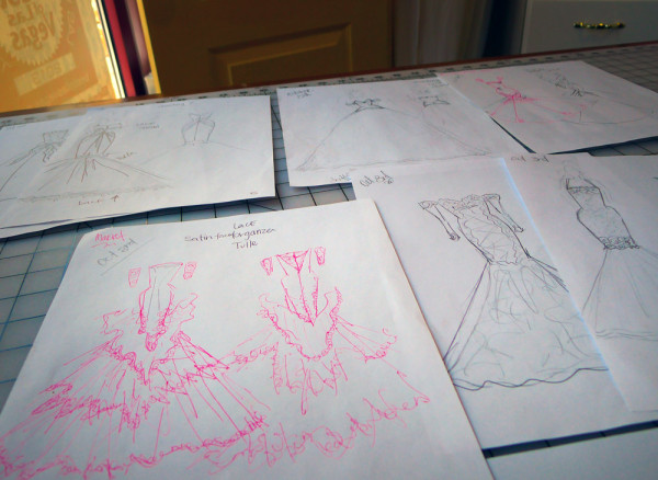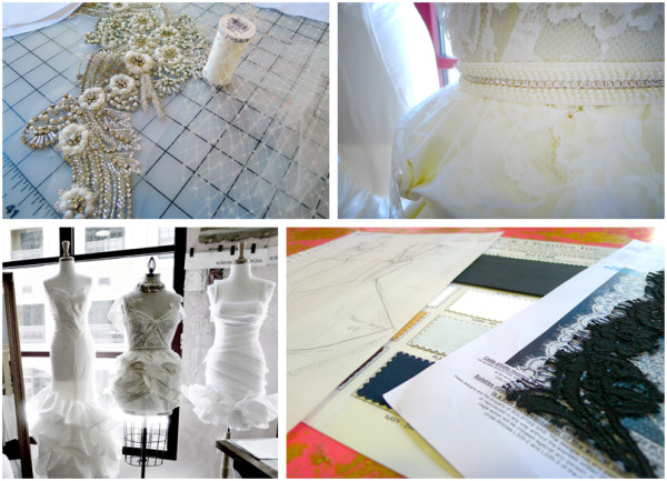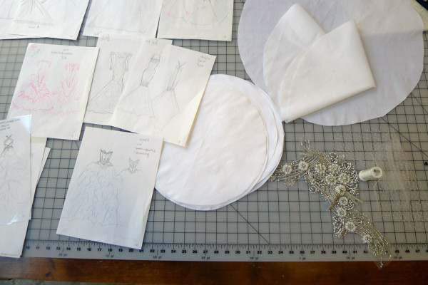 Clients come in a number of times during the process, first to talk about their desires and overall look, with later visits to fit the gown and finally to come pick up the finished piece. Â (A sad moment, Megan admits…)