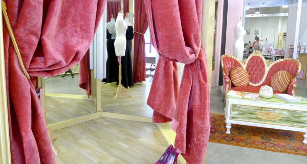 Located in the stylish entertainment district of Tivoli Village, Megan’s shop is on the second floor of The Market LV. With huge windows letting in natural light that falls on finished and partially finished gowns on dress forms, a fitting room with heavy velvet curtains reminiscent of a royal dressing room and inspiring images all around I fell in love with the slightly industrial Mina Olive space right away. It felt like it was bursting with creativity and energy!