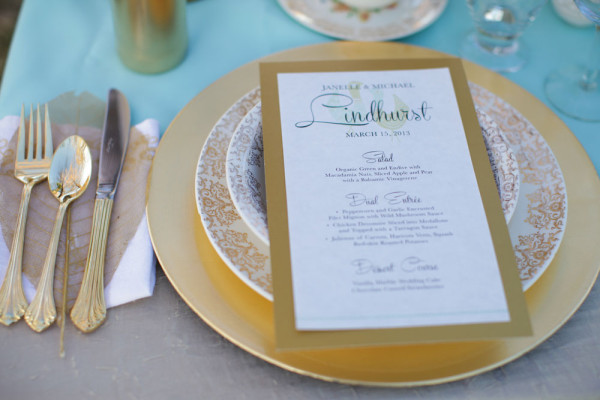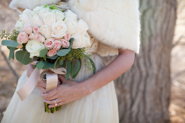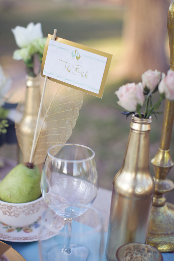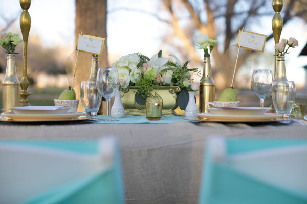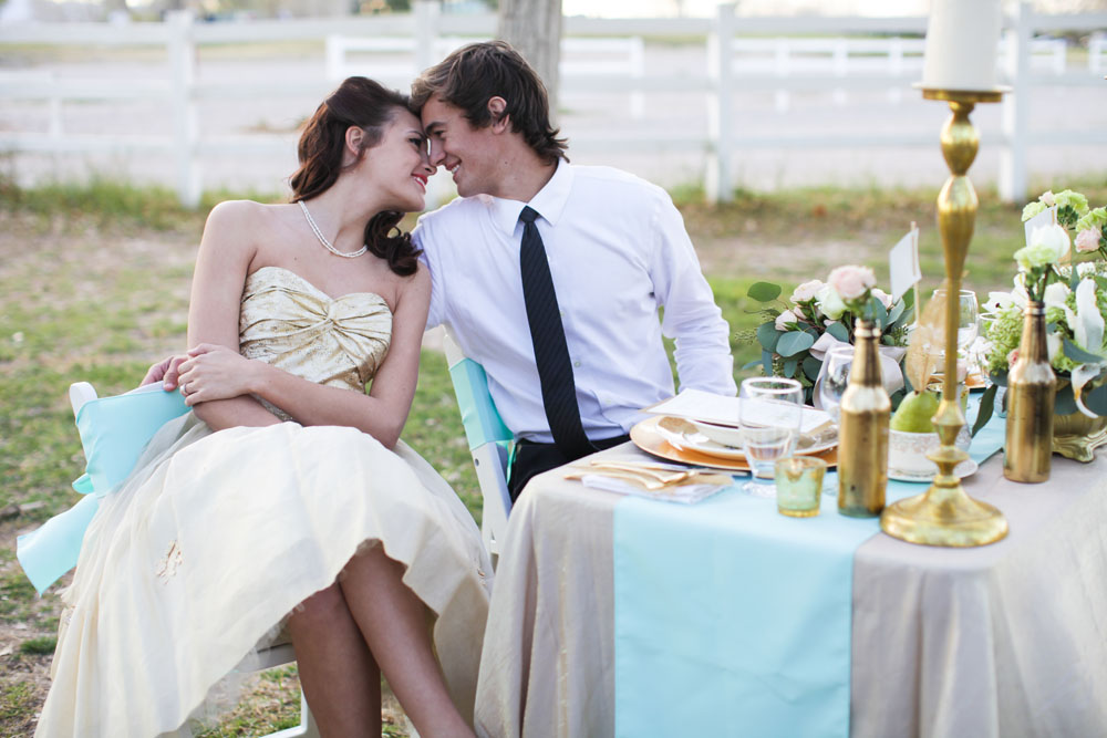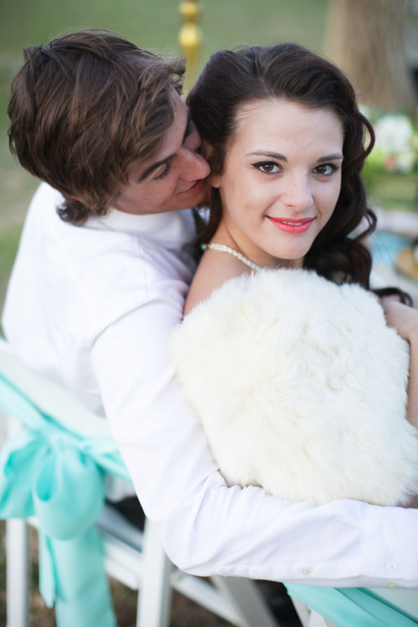 Shot at Floyd Lamb State Park, this faux wedding featured 1950s details, a golden tablescape with peach and pale pastel tones atop Tiffany blue linens. The “bride” Lauren, even wore a golden gown with a cozy fur stole.