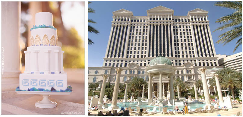 Pinterest, Flickr, on other wedding blogs, cake blogs, in cake studio windows…they all feed the addiction. And if you’re a Vegas hotel obsessed blogger this just sort of blends together after a while, and sometimes, well, the cakes start to look like Vegas hotels. Or is it the other way around?