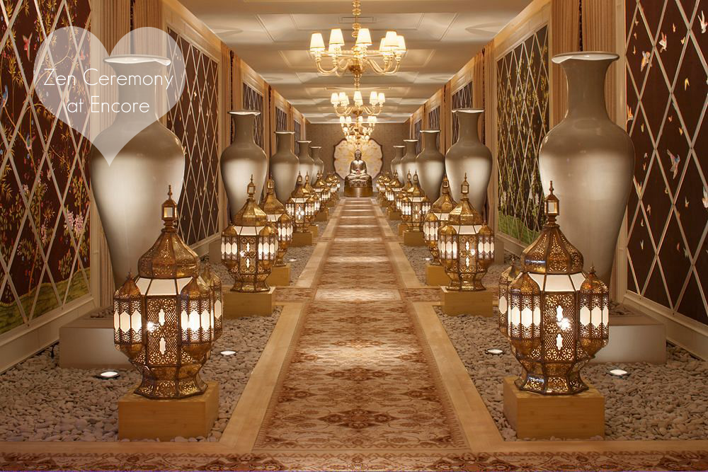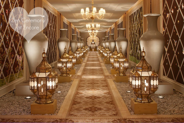 The ceremony, called the “Zen” package, actually takes place during off hours inside the main foyer of Encore’s Spa, which has an Eastern theme with Buddha statues, golden Moroccan inspired decor and plush Persian carpets. There is only enough room for a handful of guests to take part in your ultra exclusive elopement, making it a once in a lifetime memory for all involved.