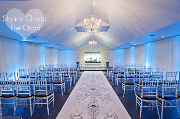 The color theme of the secluded chapel at ARIA is mostly neutral paired with rich purple draping and touches of wood and metallic detailing throughout. Rich fabrics and design the chapel feel like an extension of the sleek modern hotel it is within. The bridal suite and grooms ready room feature little treats like huge LCD TVs, pool tables and wet bars. Not only does this chapel host the latest in modern decor, it’s also technologically advanced and is LEED Gold certified for environmental sustainable practices.